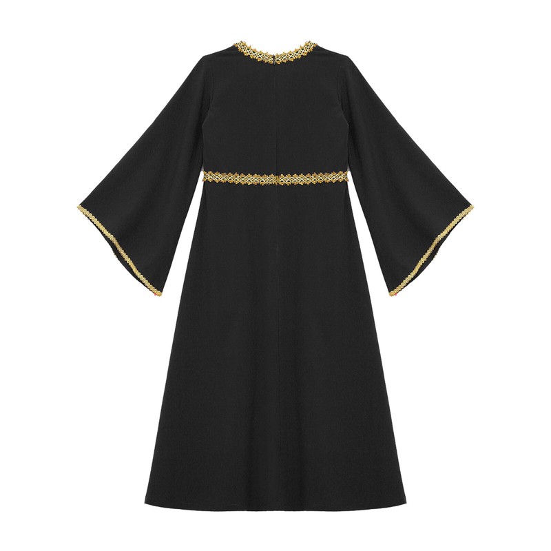 Designed with square neck, long sleeve with bell bottom, high waist full length dress. Back zipper closure.