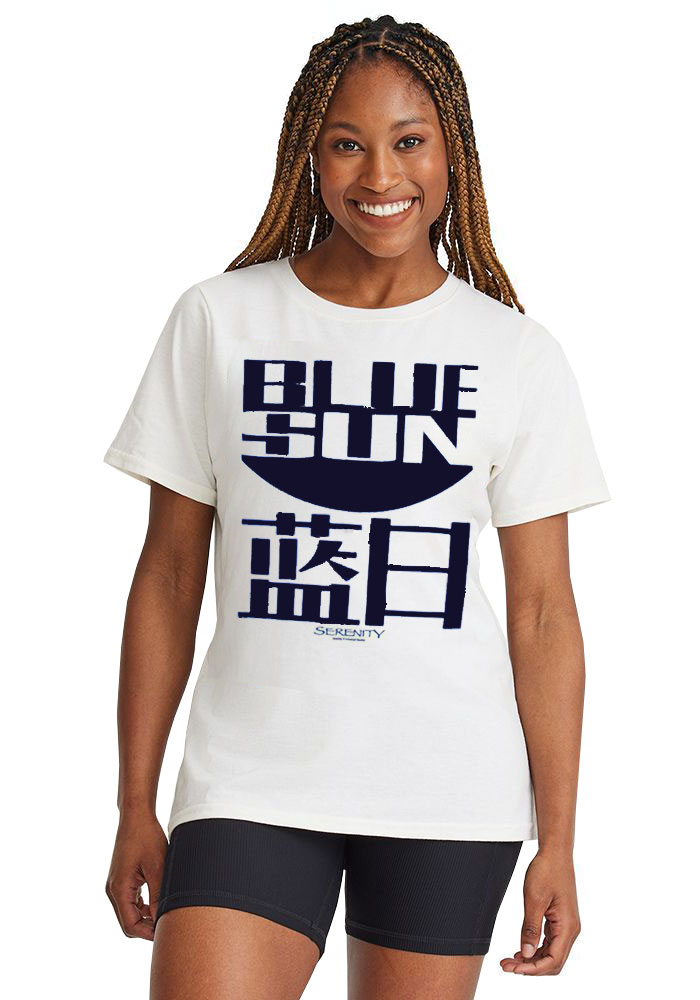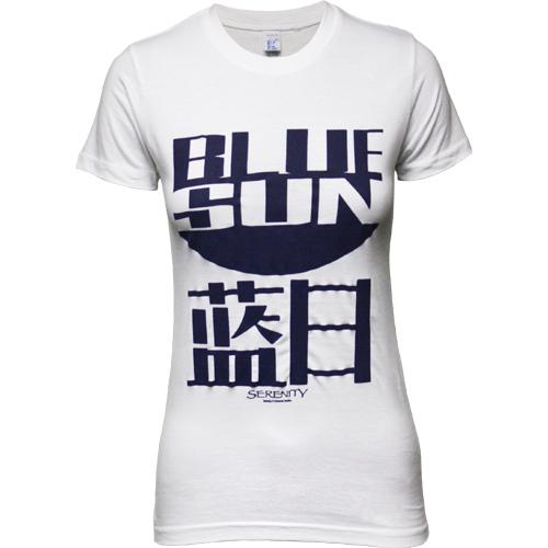 Live life with Blue Sun! This cool t-shirt features the logo of the Blue Sun Corporation, from the hit tv series "Firefly" (and follow-up movie, Serenity). Blue screen print on a white tee. Juniors girl's sizes. 100% cotton.