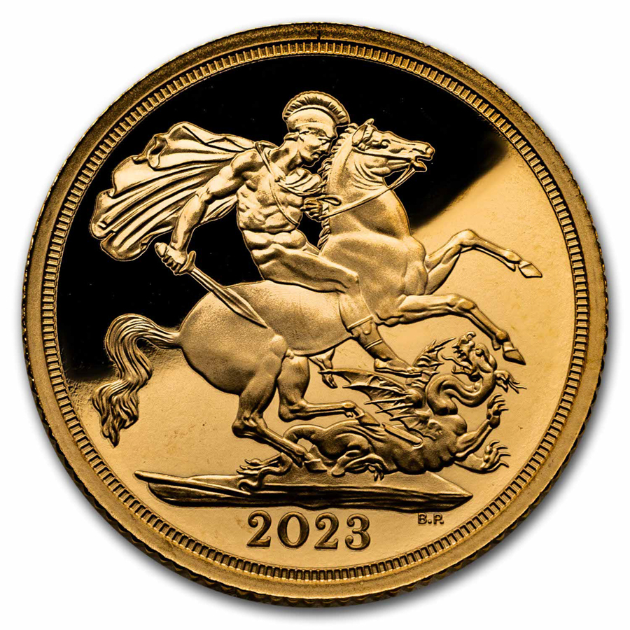 The sovereign continues to be recognized as a Gold coin of beauty, quality and value, and is considered by many as the flagship coin of The Royal Mint. Add this 2023 Gold British Sovereign in Proof condition coin to your cart today!