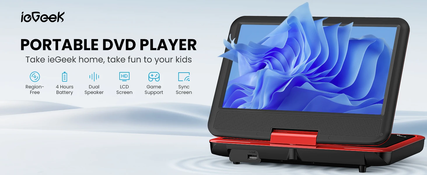 👨👩👧 Portable and Magical ---- Compact design makes it easy to carry out with you. Take it on your road trip, be companioned by your child, brings tons of fun for your journey. ieGeek DVD player can be easily swiveled as a tablet and mounted to the car headrest.