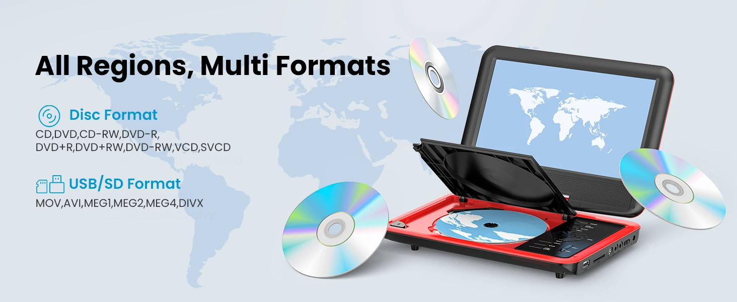 👨👩👧 All Regions, Multi Formats ---- Supports CD, DVD, DVD+R(-R), DVD+RW(-RW), VCD, SVCD-R(RW), CD-R(RW) from 6 regions (Blu-ray and pirated discs are not supported); ieGeek also supports multi-media files via USB and SD Card (16-32GB), such as VOB, AVI, MPEG, MP3, WMA, JPEG.