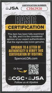 Note that as of 2024, only JSA is issuing basic certificate of authenticity (COA) cards with stickered items. BAS (Beckett) now utilizes a QR-coded and numbered sticker and announced in 03/2021 that they eliminated printed certification cards and fully transitioned to digitial certificates. In 10/2023, PSA announced that they will no longer be issuing basic certificate cards with items that pass authentication and instead will rely on the unique certification number and verification on PSA's site. Note that this process applies for basic certications only, any Letter of Authenticity upgrades or premium items still include a certificate. For any of my listings, if an certificate card is included, a scan of the card will appear in the listing.