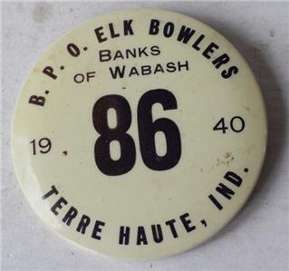 Here is a great vintage 1940 B.P.O. Elks Bowlers Banks Of The Wabash Terre Haute Indiana #86. It is Awesome. There are spots on the pin-SEE ALL PHOTOS. It measures about 3 inches tall by about 3 inches wide. Grab this great Vintage Collectible while you still can it will not last long.