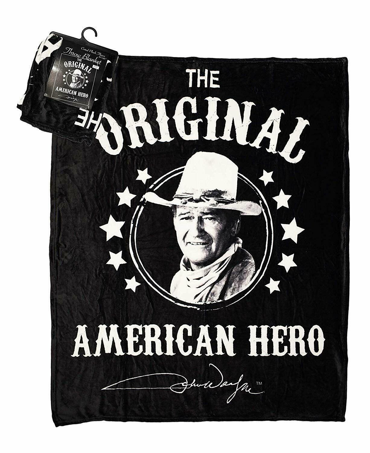 John Wayne coral plush fleece throw blanket in black & white displaying, "The Original American Hero". The graphics include a headshot of the Duke wearing a cowboy hat with white stars, guns and his signature. Makes for a good gift. This blanket can be used for warmth in the winter, spring and fall. Display on couch, sofa, bed or other furniture to enhance existing bedding or home decor. This item comes packaged with a hang tag for easy display.