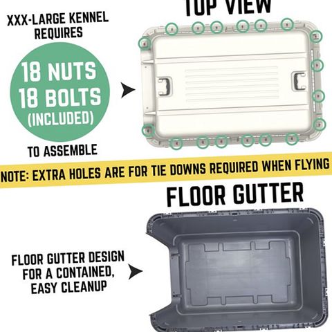 We also had airline travel in mind when designing this kennel. We include everything you need should you chose to ever fly with your dog. Check out our VIDEO here on this page for a quick tour of kennel features. Crate/ kennel assembly is fast and easy. Locking snaps hold the kennel halves together; additional included metal hardware locks the kennel together giving you peace of mind that your crate will make it'safe and secure. Some dogs chew their escape through plastic ventilation holes. We use metal slats to mitigate the chewing problem and keep your pet safe. Accident moat pulls spills away from your pet’s body, out to the edges of the kennel strong metal kennel door with a smooth, easy-to-grasp latch thick impact resistant poly shell can take a wallop and keep on going pet parents should check with their airline before a trip. Airline and cargo carrier rules vary between countries and airlines.