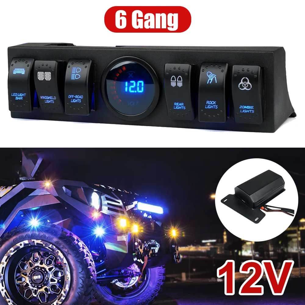Bright blue illuminated switches and voltage indicator.