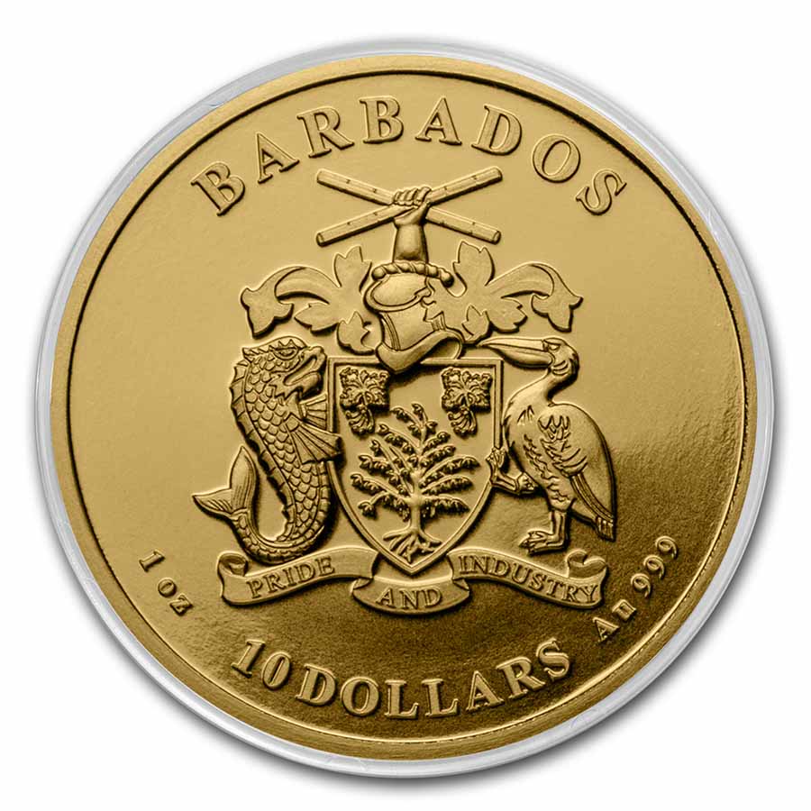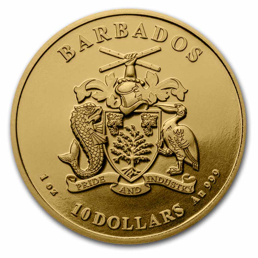 - Obverse: Displays the Barbados coat of arms along with the face value and purity. The Golden Shield of the Arms carries two Pride of Barbados flowers (the National Flower) and the Bearded Fig Tree (ficus Citrifolia). On either side of the shield are the supporters-on the right is a dolphin symbolic of the fishing industry and on the left is a Pelican, after Pelican Island, a small outcrop later incorporated into the Deep Water Harbour development. Above the shield is a helmet and mantling and on a wreath is the arm and hand of a Bajan holding two crossed pieces of sugar cane symbolic of the sugar industry. The Coat of Arms carries the motto Pride and Industry.