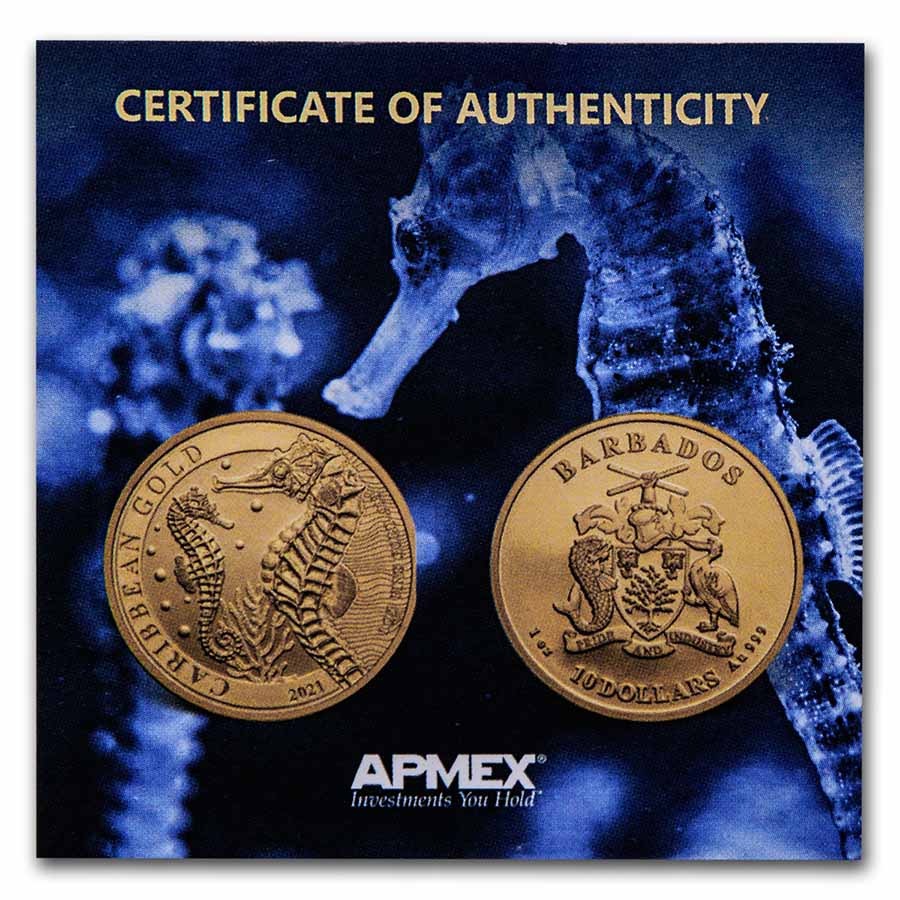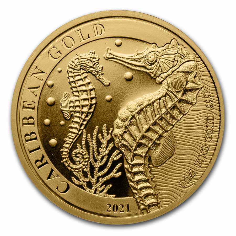 This is the third coin in the Caribbean Gold series featuring the unique seahorse. Each year a new design features the seahorse or in this year's coin a couple of seahorses. The Gold coin was added on the second year of this series because of the popularity of the Silver and APMEX wanted to give customers another option for their collection. All previous coins in this program have sold out and are difficult to find in the market.