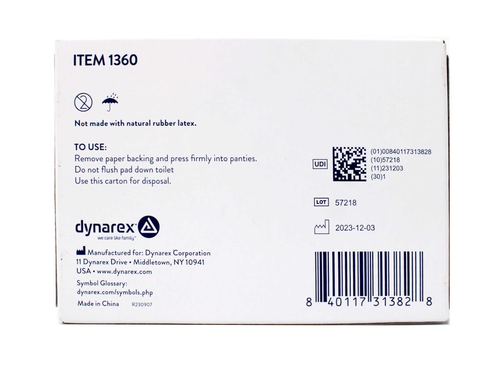Dynarex Maxi Pads are crafted to provide reliable absorbency and protection during menstrual flow. The Maxi Pads are made with breathable materials for enhanced air circulation and improved ease-of-wear. The Pads are available in a variety of designs and absorbencies, with and without wings. Highly absorbent pads designed to provide enhanced protection and comfort Crafted with breathable materials for improved ease-of-wear Designed to provide up to 8 hours of protection. 1360: Features curved, channeled design to help contain fluids for added protection