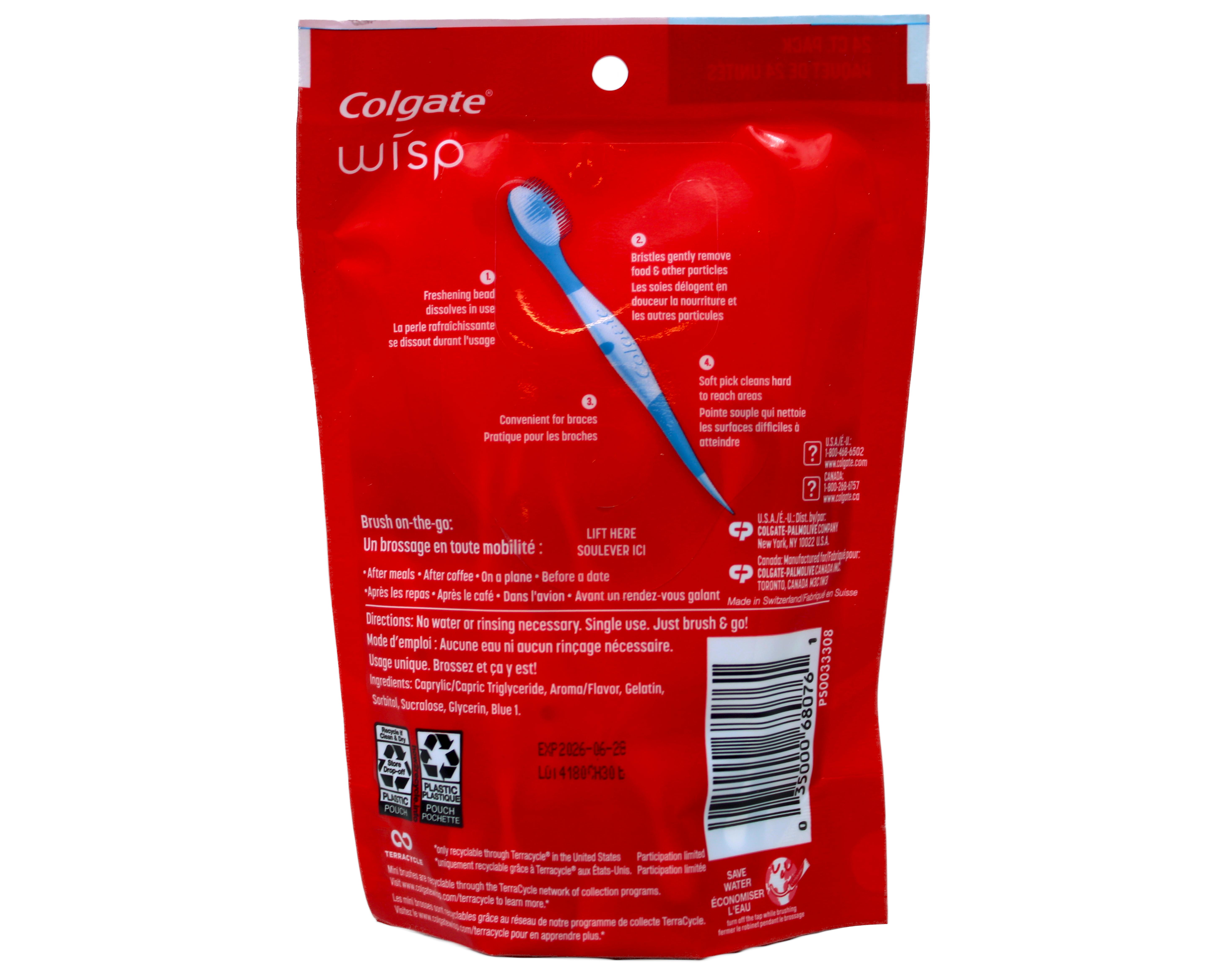 Get clean teeth and fresh breath on the go with the Colgate Max Fresh Wisp Disposable Mini Toothbrush, Peppermint. This pocket-sized, soft bristle, mini-toothbrush brush delivers the freshness of gum and the clean of a toothbrush in one effortlessly portable device. Its built-in, sugar-free peppermint bead easily dissolves and delivers a rush of minty freshness while the bristles gently remove food and other particles. A soft pick at the handle base of this disposable toothbrush removes food particles from any hard-to-reach areas. No water or rinsing is necessary. Brush your teeth on the go, anytime, anywhere Mini prepasted toothbrush, no rinsing necessary Whitens teeth by removing surface stains Single use disposable travel toothbrush Sugar free, gluten free Great to keep in the home, office, or backpack Great peppermint flavor Adult Peppermint
