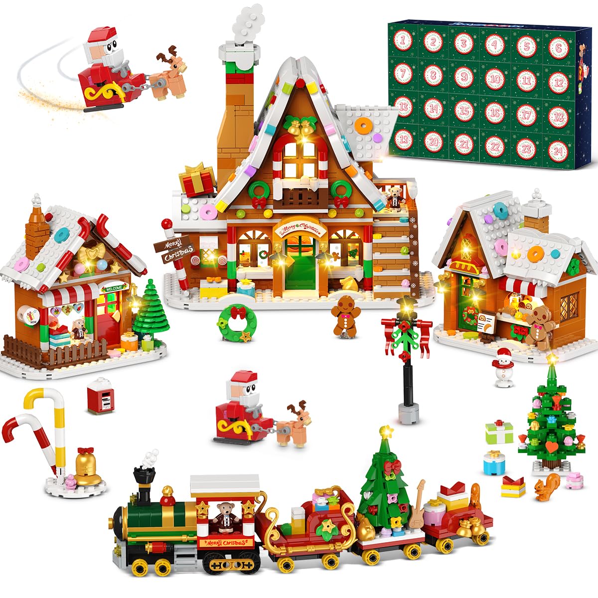 24 Days Christmas Advent Calendar Building Set - Celebrate the arrival of Christmas by building the INSOON snowscape village house building block toy! Starting December 1st, open one of the 24 numbered boxes each day to create a Christmas village gradually. Each box contains different building pieces, keeping the unboxing excitement going for 24 days. By Christmas Eve, you’ll complete a charming gingerbread house village! Gather your family to build this festive countdown building set together 2025 Christmas Village House Building Kit - This elaborate gingerbread house toy brings together a superb variety of Christmas themes! You’ll get 3 charming gingerbread houses with frosted roofs, plus a decorated tree, gift-loaded train, Santa in his sleigh, smiling gingerbread man, classic candy canes, a scarf-wearing snowman, green wreath, gift-carrying squirrel, and a special mailbox! Dive in and build your very own Christmas village house! Feel the festive joy come alive in your hands Magical LED Lighting - Ignite the holiday spirit with a warm, glowing ambiance! This holiday village house building toy features a long-lasting LED lighting system. Each gingerbread house has customizable lights so you can create your perfect Christmas nightscape. Whether as a stunning party centerpiece or accenting your living room, office, or bedroom, this glowing village instantly upgrades any space, transforming ordinary corners into extraordinary holiday displays filled with festive cheer Premium 3.6mm Building Blocks - Designed for quality, this Advent Calendar 2025 Building Kit features 1,955 eco-friendly ABS pieces. All architectural-grade 3.6mm-thick blocks are non-toxic and odorless. Organized into 24 packs (approx. 100 pieces each) with intuitive instructions for effortless assembly. Perfect for collaborative family building that sparks connection, transforming your finished holiday village into an heirloom-quality keepsake brimming with cherished memories Perfect Holiday Gift - Our Christmas countdown gingerbread house village set is the ultimate seasonal surprise! Designed for ages 12 and up to adults, it comes gift-ready with premium packaging and crystal-clear instructions for instant building joy. The unique 24-day advent calendar design delivers daily surprises, making the wait for Christmas a special ritual. Pick this thoughtful gift that turns holiday anticipation into cherished memories for friends and family