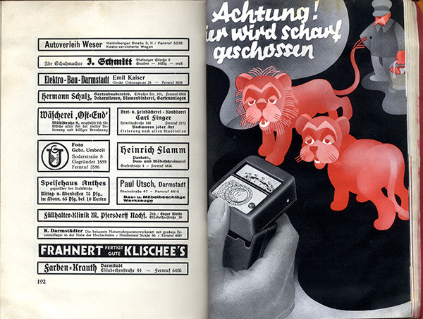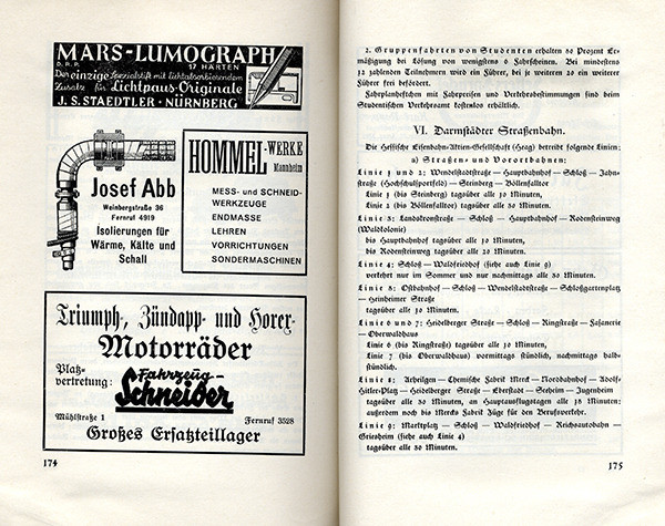 mit GESAMT 224 Seiten photographischen und druckgraphischen Abbildungen,Grußworte an die Studenten alte Sagen aus Darmstadt die studentische Selbstverwaltung an der Hochschule Vorstellung der Studienfächer Fakultäten und Abteilungen der Universität die Bibliothek der Technischen Hochschule das Straßen und Verkehrswesen in Darmstadt und Umgebung Reichsbahn und Straßenbahn Fahrkarten und Vergünstigungen für Studenten die studentischen Vereinigungen in Darmstadt Kalender zum Studienjahr. außerdem Anzeigen und Inserate regionale Firmen und Geschäftswerbung