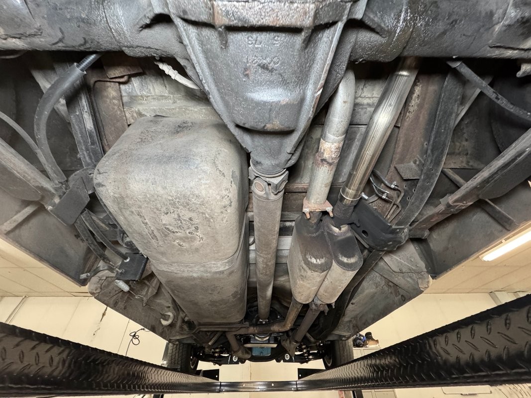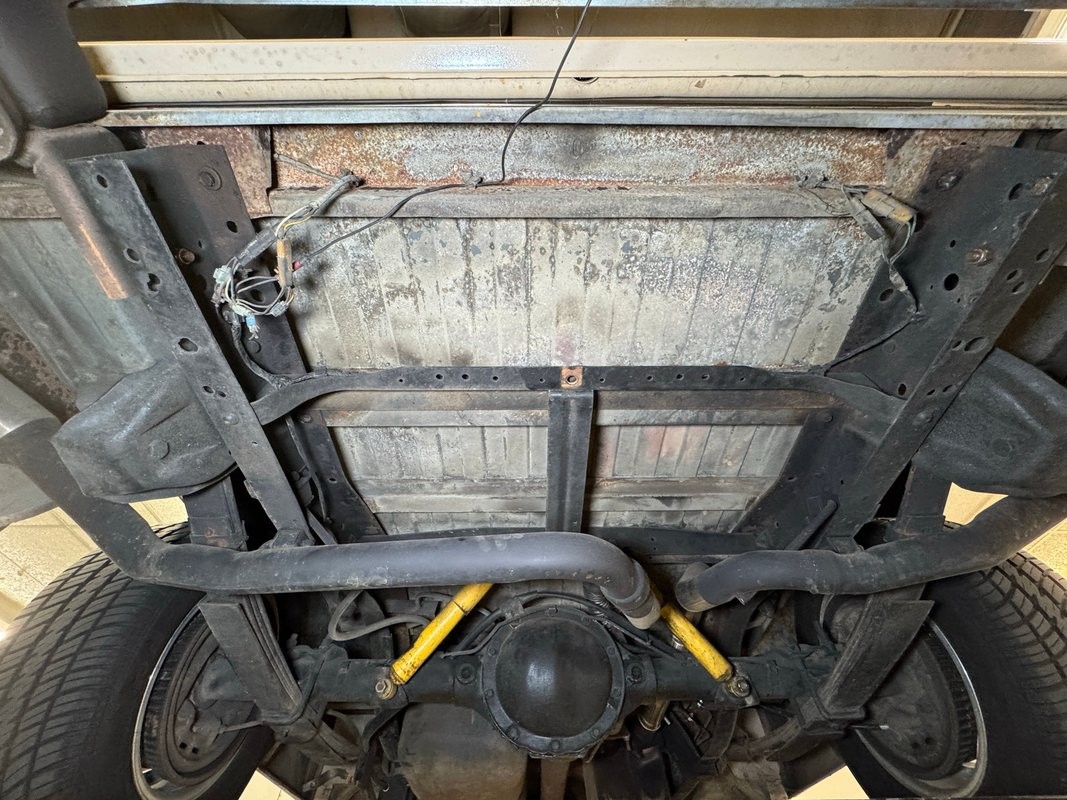 Clean and driver quality underneath where the headers give way to dual exhaust and FlowMaster mufflers before exiting through the body on the sides. There are no catalytic converters on board. Brakes consist of power disc up front and power drums in the back and the lowered suspension includes front coil springs and front control arms from a van, and rear leaf springs with a rear axle flip.