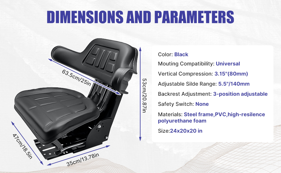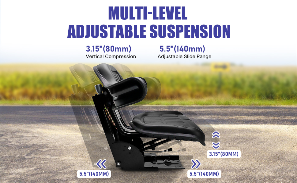 >>>- This tractor suspension seat also has suspension and shock absorption function, which offers a 80mm / 3.15" compression range and supports weight from 120lbs - 400lbs, can meet the different needs of customers.