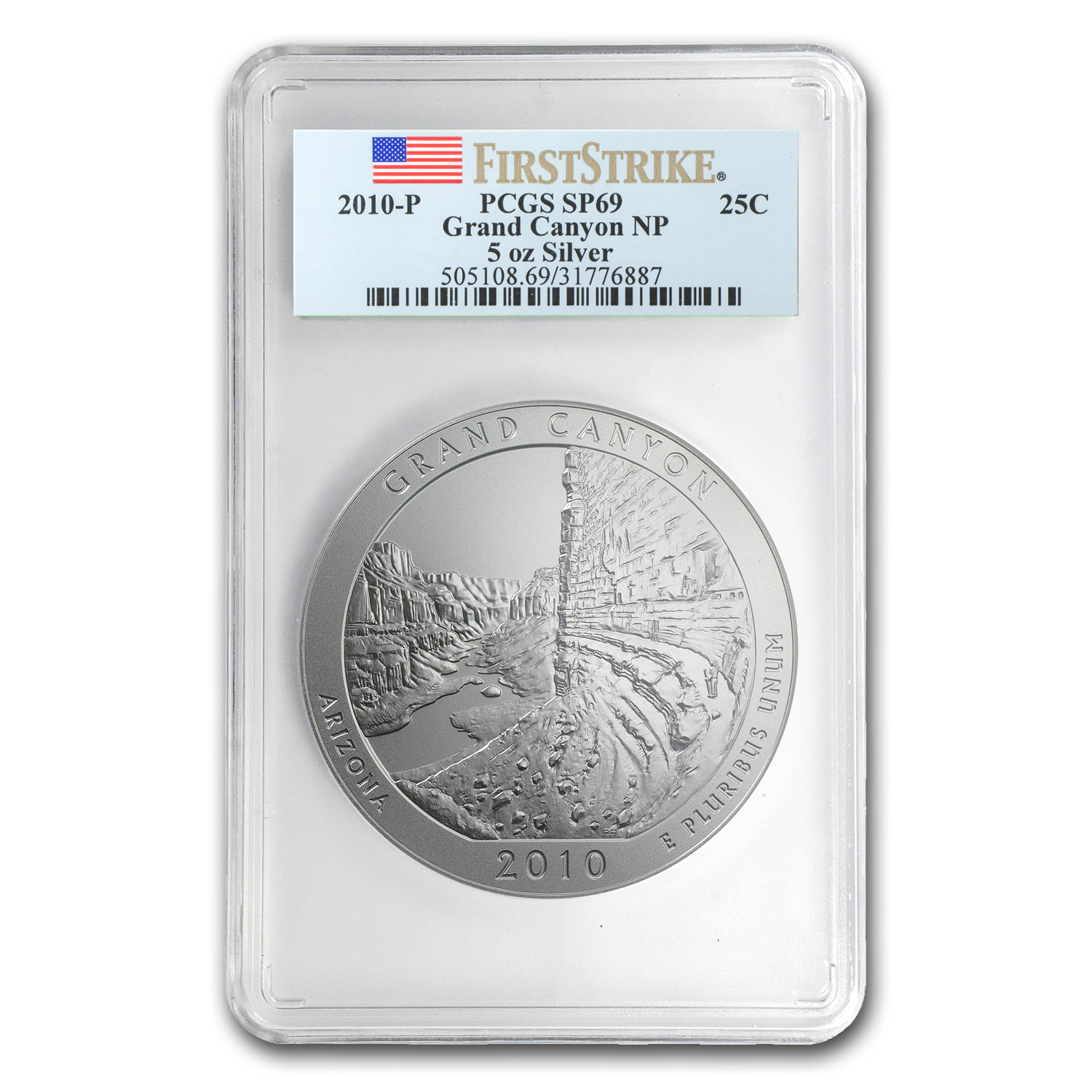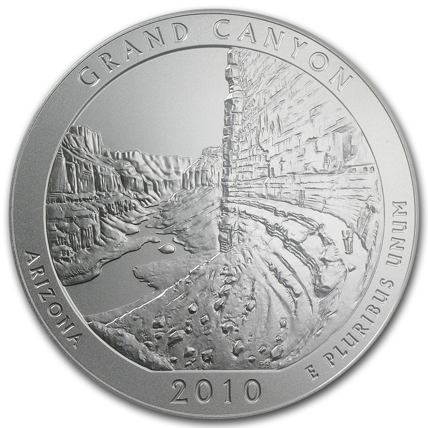 - Reverse: Image of the Grand Canyon wall, surrounded by Grand Canyon, Arizona, E Pluribus Unum and the date.