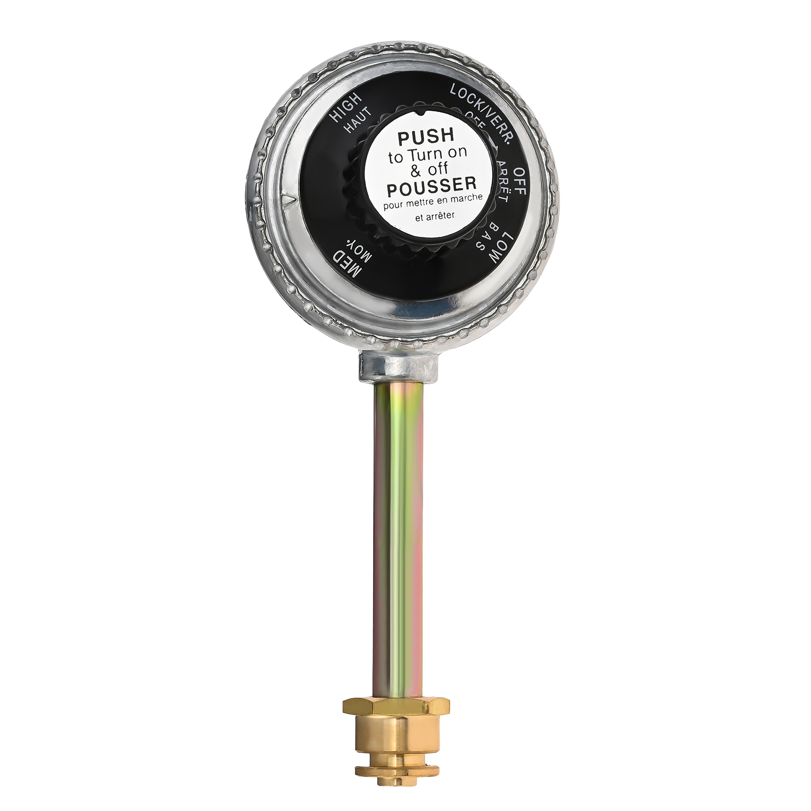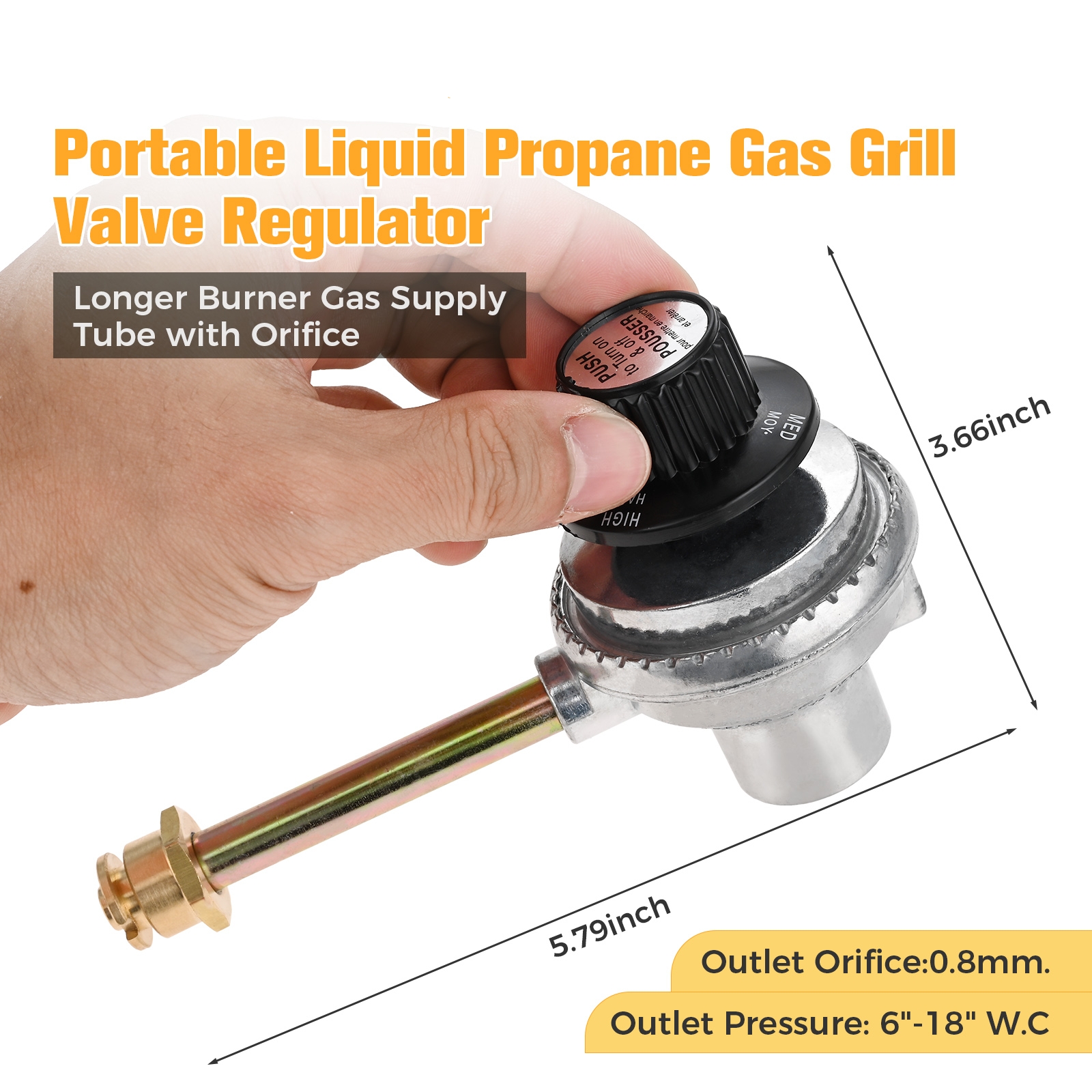 5, Propane Gas Grill Control Valve: Knob switch regulating valve; Push to turn on &off (from gas flow low -Med - high ); Outlet Pressure Range: 6”-18” W.C