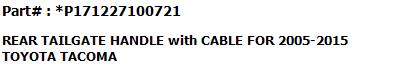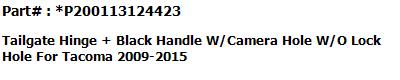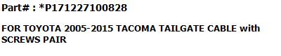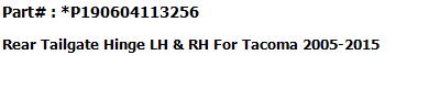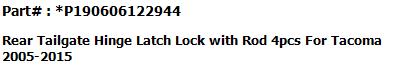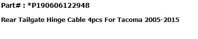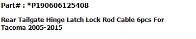| This is a Brand New replacement parts for For Toyota Tacoma 2005-2015 #1 Tailgate Hinge LH #2 Tailgate Hinge RH #3 Tailgate-Lock Striker #4 Tailgate-Lock Striker #5 Tailgate Cable with Screws #6 Tailgate Cable with Screws. |