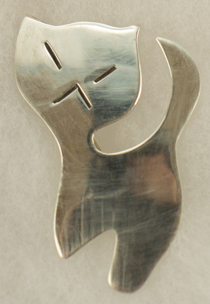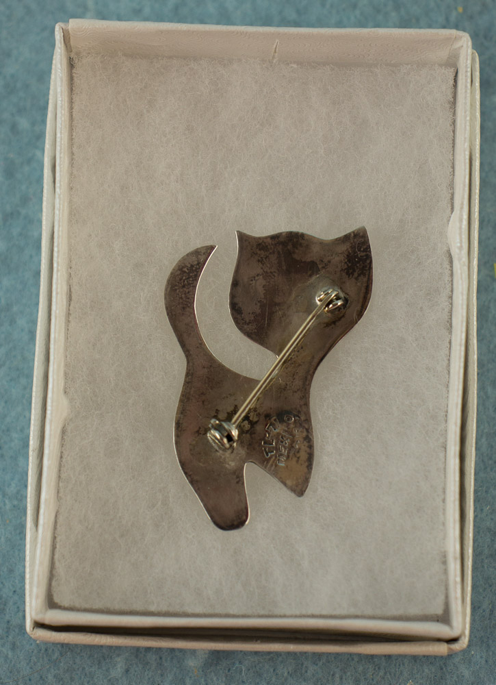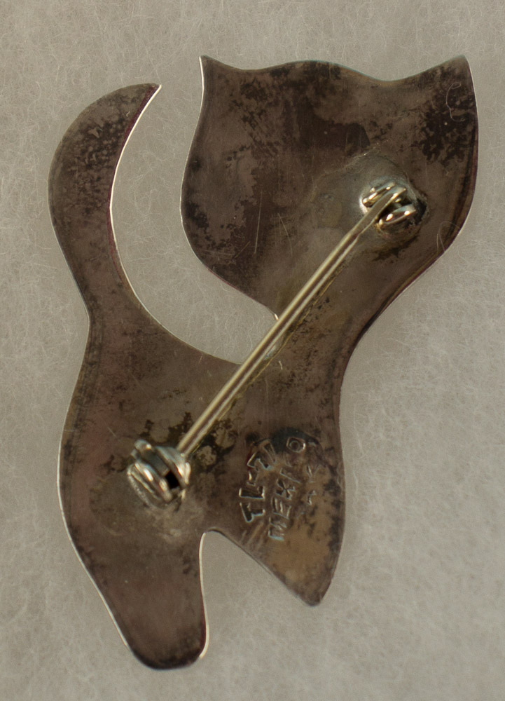 Here is a vintage 925 Mexico sterling silver cat pin. It's about 1.75" long at the tallest point. It's in very good condition with some light brush marks across the pin. Please see the pictures to see how this looks.