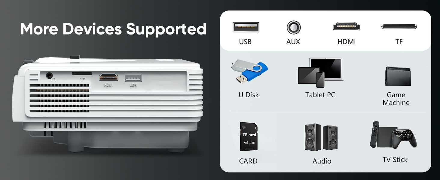 【Multiple Ports and Wide Compatibility】This portable movie projector is perfect for playing videos, TV series, photos sharing, football matches etc. It can be easily connected with laptops, smartphones, tablets, USB drives, etc.