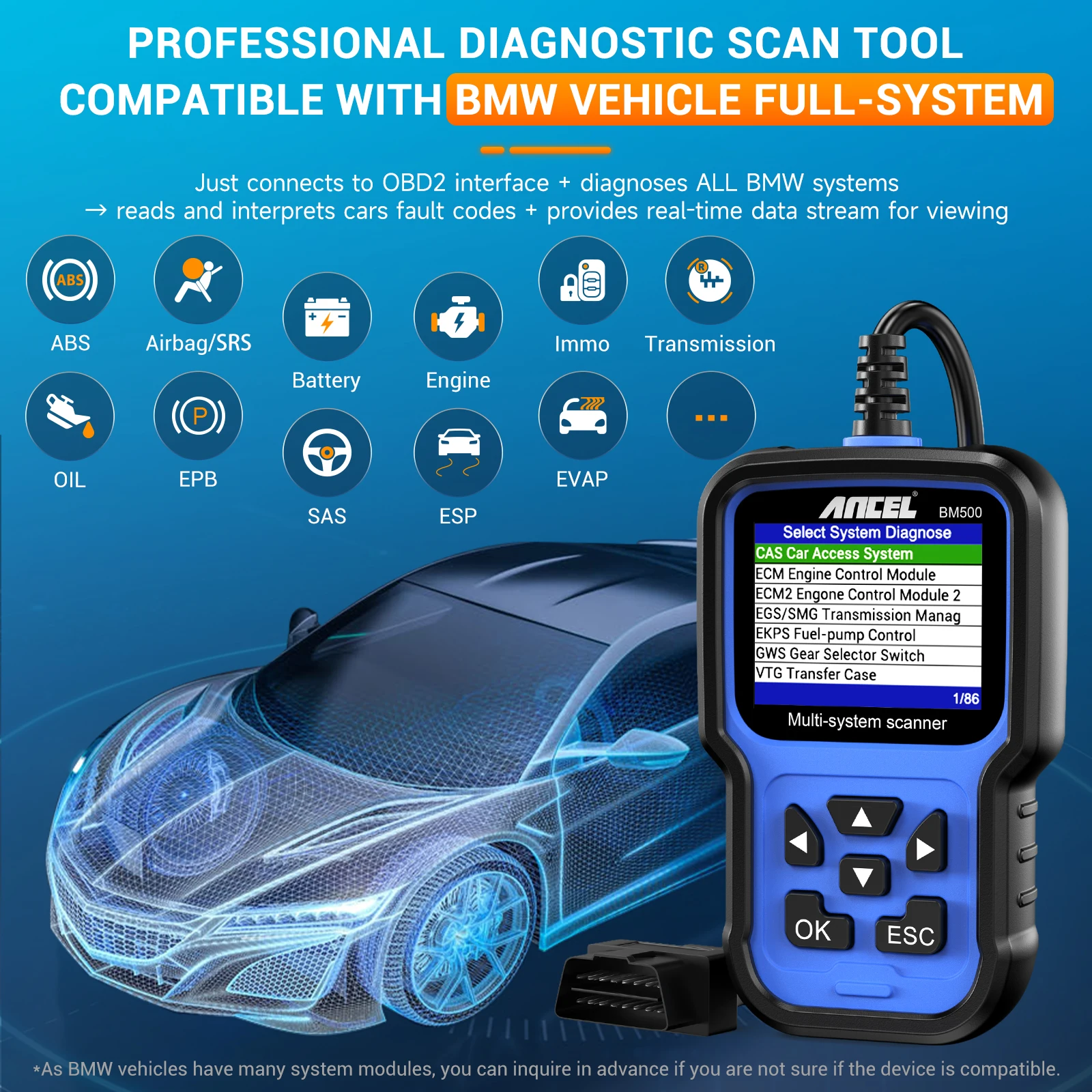 Airbag System: The SRS (Supplemental Restraint System) is a device that deploys the airbag to protect the passenger before the second collision occurs. The BM500 obd2 scanner can read/clear the code and turn off the airbag warning light.