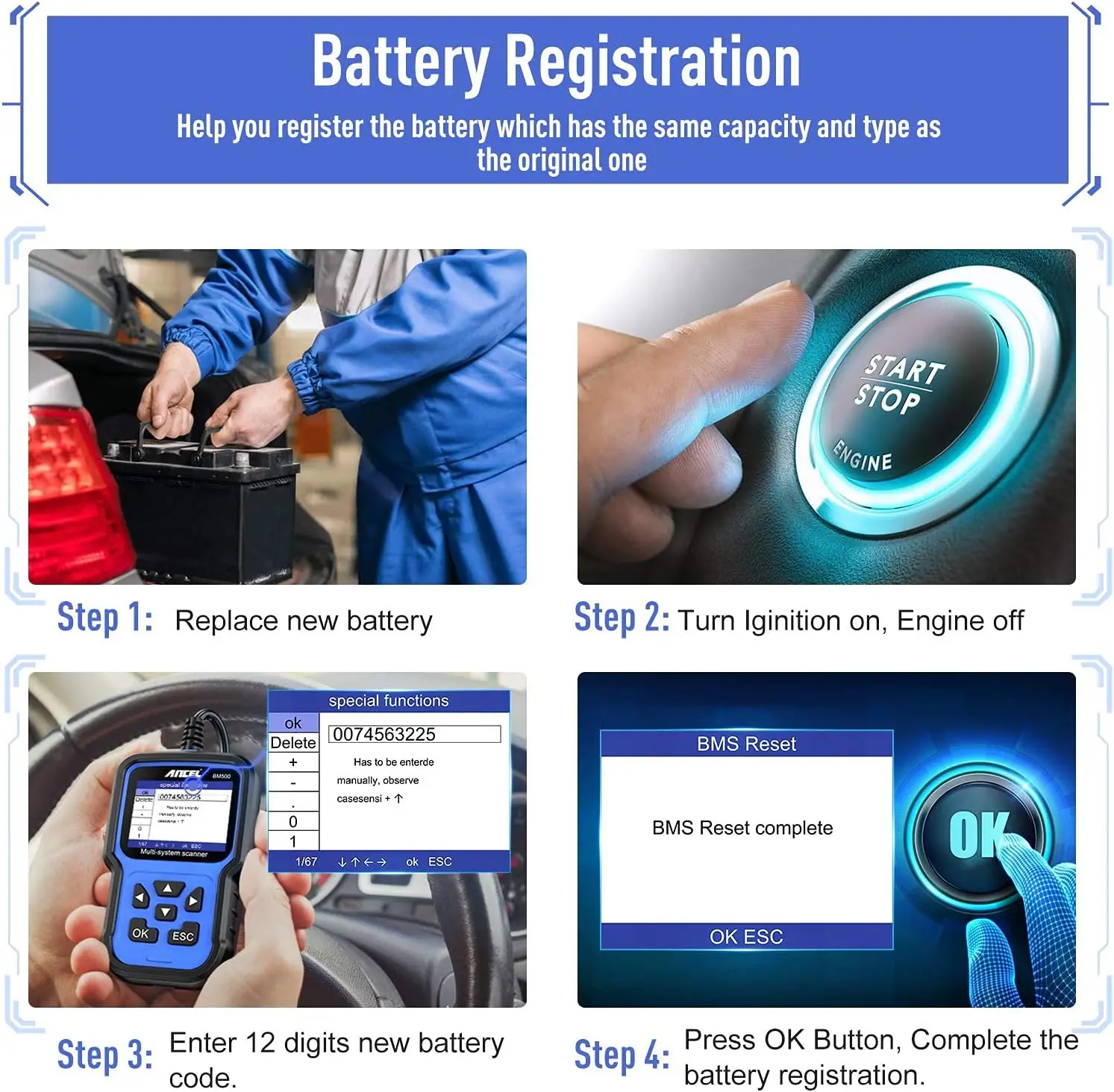 4.Choice BMS Function and Enter New battery 12 digits code or Choice Special Function - battery Management-Register a new battery.