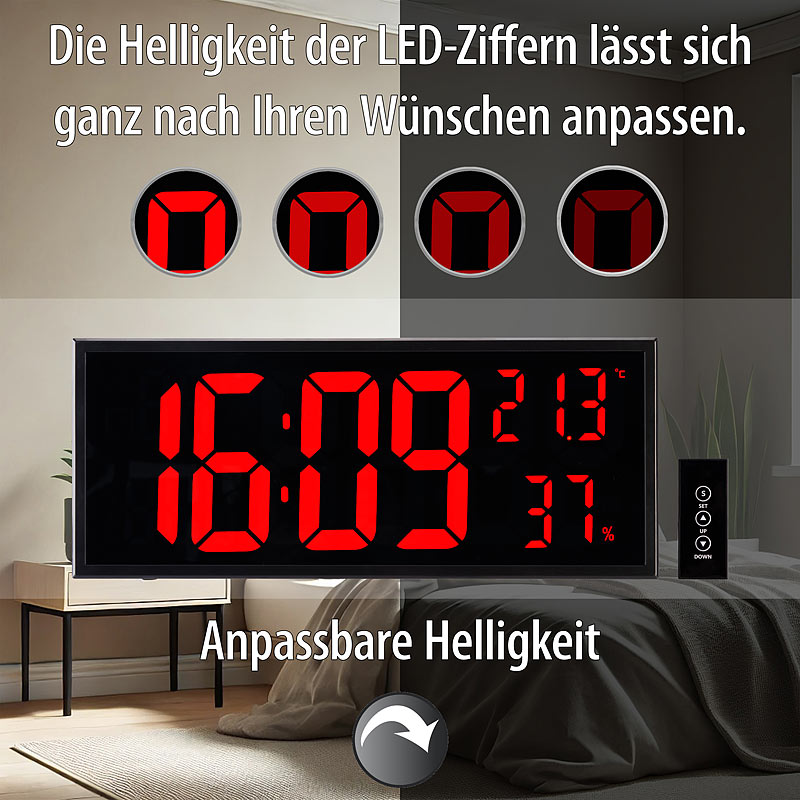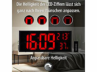 Jederzeit gut ablesbar: Die 12 cm hohen Jumbo-Ziffern aus roten LEDs sind besonders gut zu erkennen, auch wenn es dunkel ist und Sie nicht unmittelbar vor Ihrer Wanduhr stehen. Die Helligkeit der LED-Ziffern stellen Sie ganz nach Bedarf in mehreren Stufen ein. Lassen Sie die Helligkeit auch automatisch anpassen! Dann werden die LEDs nachts gedimmt und schalten morgens wieder auf die höchste Helligkeitsstufe - perfekt z.B. fürs Schlafzimmer.