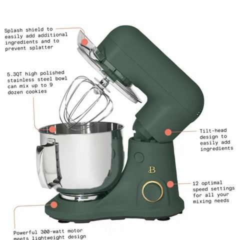 Beautiful Stand Mixer by Drew Barrymore gives convenience without compromising results. The Beautiful 5.3QT Tilt-Head Stand Mixer can mix up to 9 dozen cookies with its powerful 300-watt mixing system. With it's lightweight design, the Beautiful Tilt-Head Stand Mixer can mix a wide variety of ingredients with 12 optimal speed settings to fit your every need. For even more added convenience, this stand mixer includes a tilt-head design allowing you to effortlessly add ingredients in while mixing. Enjoy mess-free cooking and cleanup with a splash guard to prevent splatter and removable, dishwasher safe accessories. Created by Drew Barrymore, Beautiful Kitchenware combines elegant design, contemporary colors and modern silhouettes for high-performance cookware that looks beautiful in your kitchen.