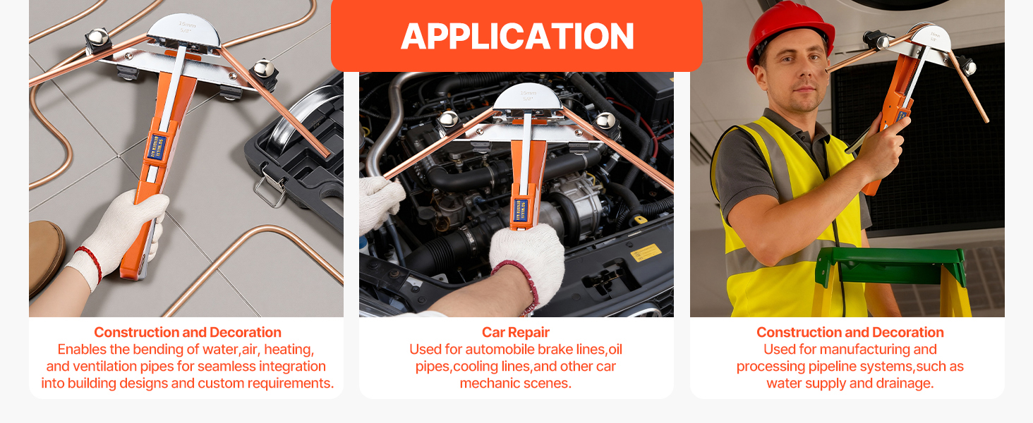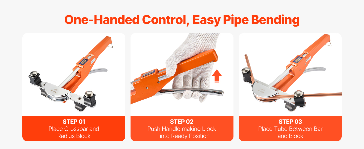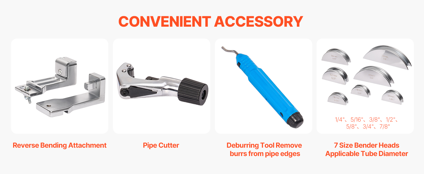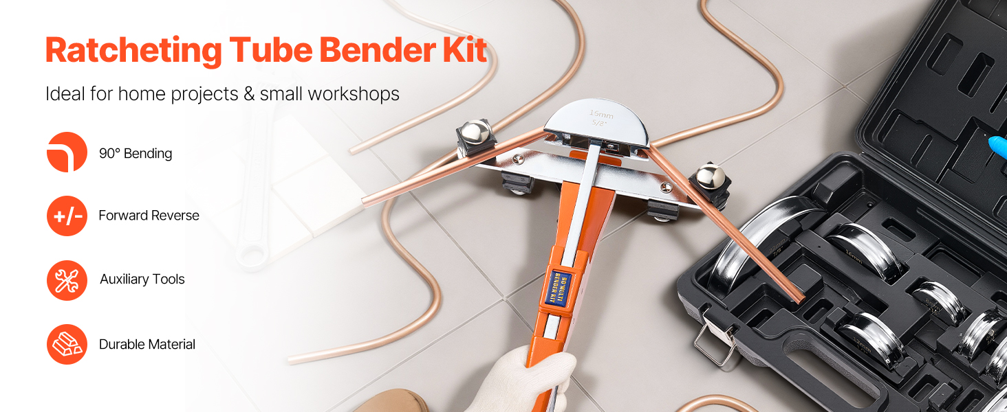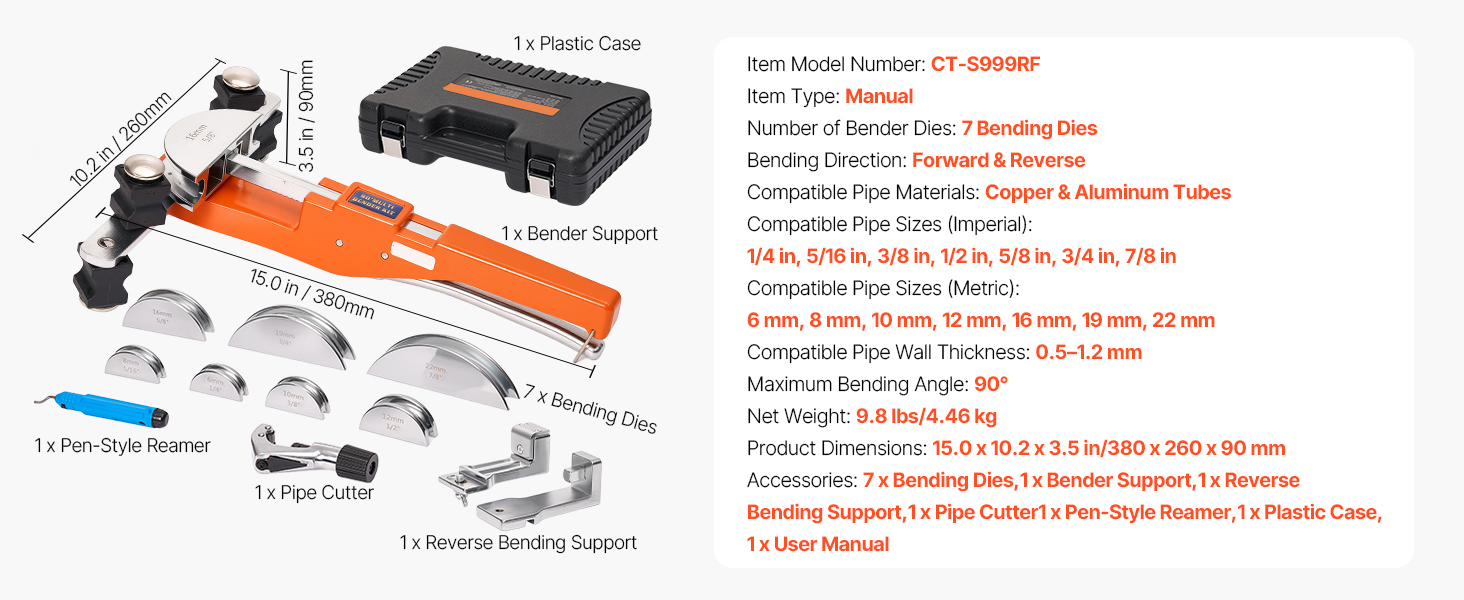 This manual ratcheting pipe bending tool is equipped with 7 dies, enabling accurate bending of copper and aluminum pipes ranging from 1/4 inch to 7/8 inch (6 mm to 22 mm). It allows for bending angles from 0° to 90°, making it suitable for tasks such as HVAC installation, automotive repairs, and DIY projects. Its compact design ensures convenient portability and storage.
