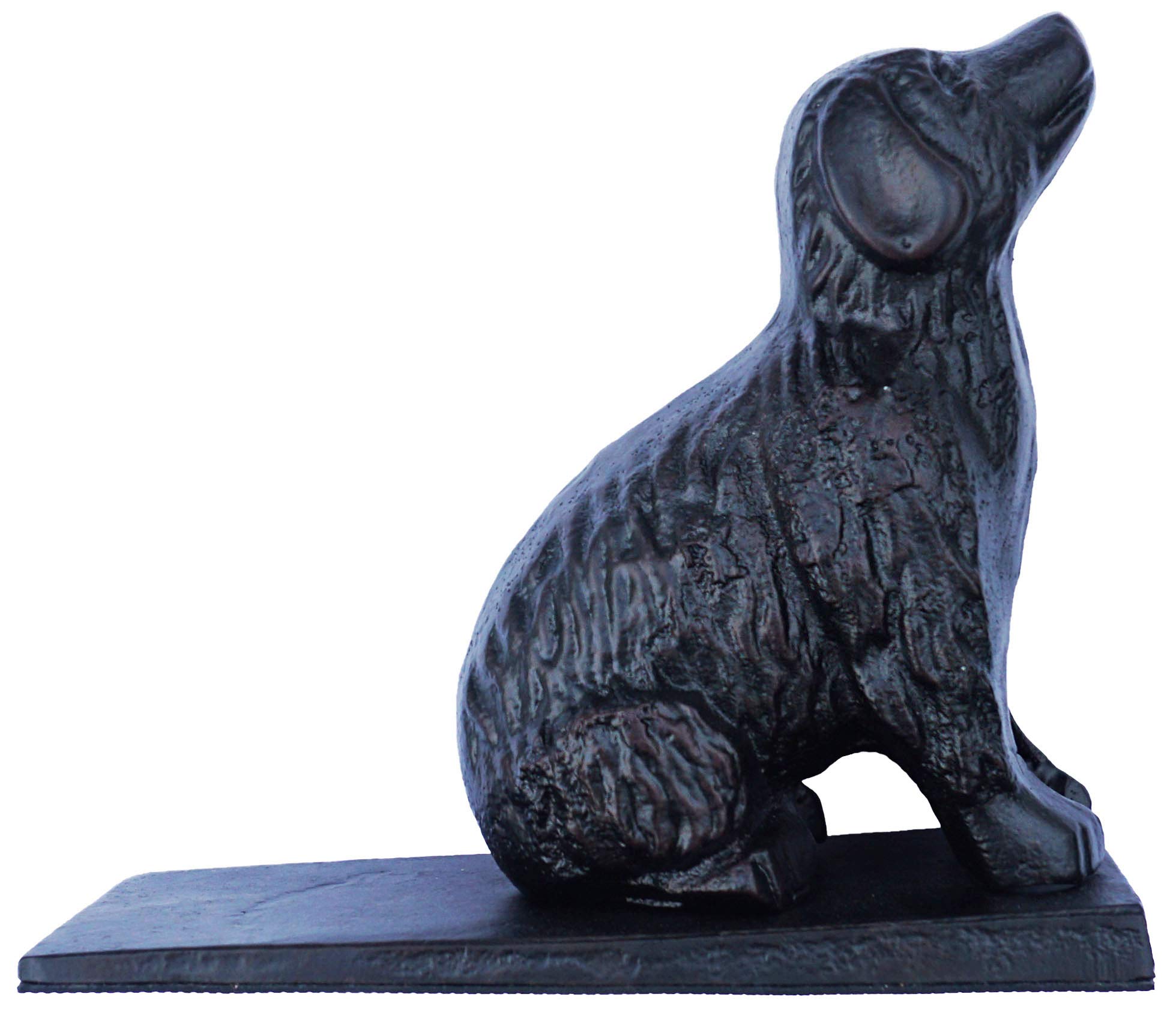 Hand crafted cast iron dog shaped door stopper. It is powder coated and has an antique look which remains the same year after year