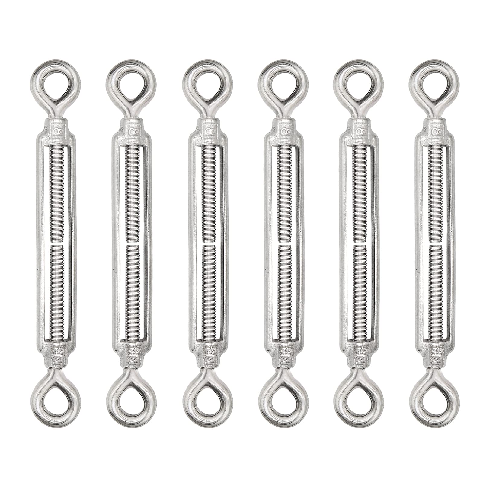 Eye & Eye TurnbuckleSpecificationsSize:M8Package: 6 pcs TurnbucklesMaterial: 304 stainless steelEye Diameter: 0.5" / 12.8mmThread Diameter: 5/16" / 8mmMax Extend Length: 11" / 28cmMin Length: 7.5" / 19cmNote1. Due to manual measurement, please allow 1-2mm difference, thanks!2. Our digital images are as accurate as possible. Because of the difference between the display and the light, the color is slightly different.