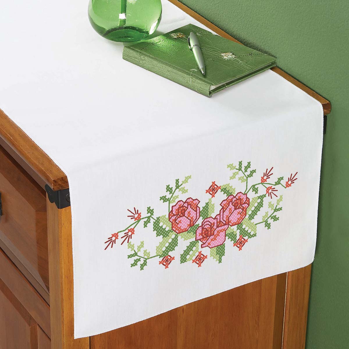 This floral dresser scarf features a bouquet of red roses and rosebuds in a timeless design for spring and summer decorating. The design is stamped for cross-stitch on white cotton/polyester fabric with a perle edge. The 14 x 44" (36 x 112cm) dresser scarf is pre-finished and ready for stitching. Simply follow the easy-to-read chart and instructions to stitch the design. Floss and needle are not included. Made in U.S.A. • This pre-finished dresser scarf is ready for stitching with red roses and green leaves. • The dresser scarf is stamped for cross-stitch on pre-finished white cotton/polyester dresser scarf with a perle edge. • Set includes dresser scarf and instructions. Floss and needle not included. • Dresser scarf measures 14 x 44" (36 x 112cm).