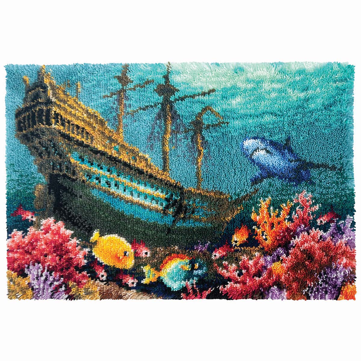 This captivating latch hook design invites you to dive under the sea to explore a shipwreck. A colorful coral reef surrounds the wooden ship, adding vibrant color to the scene as tropical fish swim along the ocean floor and a shark paroles the area. The finished project can be made into pillows, wall hangings, rugs, and more. Kit includes 3.75-mesh gridded canvas, lofty pre-cut 100% acrylic yarn, clear vinyl storage bag, easy-to-follow chart, and instructions. Latch hook tool, rug binding, and non-slip backing not included. The higher-gauge canvas of this project allows for a high level of detail in the finished design. 40 x 27" (102 x 69cm). Imported. • Latch hook rug kit includes 3.75-mesh gridded canvas, pre-cut 100% acrylic yarn, clear vinyl storage bag, chart, and instructions. • Design features a shipwreck on the ocean floor surrounded by a colorful coral reef as tropical fish and a shark swim nearby. • The finished design measures 40 x 27" (102 x 69cm). • Latch hook tool, rug binding, and non-slip backing not included. Please note: To keep rug from slipping, a non-skid rug backing is recommended.