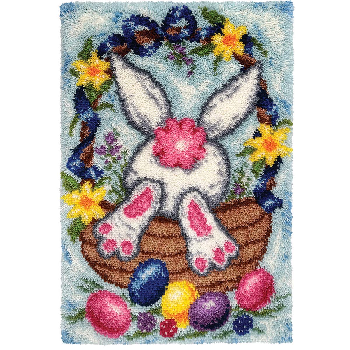 This cheerful latch hook design features a special delivery from the Easter Bunny as it hops into a basket to deliver colorfully painted eggs. Sunny yellow daffodils and swirling blue ribbon embellish the basket handle with springtime charm. The finished project can be made into pillows, wall hangings, rugs, and more. Kit includes 3.75-mesh gridded canvas, lofty pre-cut 100% acrylic yarn, clear vinyl storage bag, easy-to-follow chart, and instructions. Latch hook tool, rug binding, and non-slip backing not included. The higher-gauge canvas of this project allows for a high level of detail in the finished design. 27 x 40" (69 x 102cm). Imported. • Latch hook rug kit includes 3.75-mesh gridded canvas, pre-cut 100% acrylic yarn, clear vinyl storage bag, chart, and instructions. • Design features the Easter Bunny jumping into a basket decorated with daffodils and blue ribbon surrounded by colorful eggs. • The finished design measures 27 x 40" (69 x 102cm). • Latch hook tool, rug binding, and non-slip backing not included. Please note: To keep rug from slipping, a non-skid rug backing is recommended.