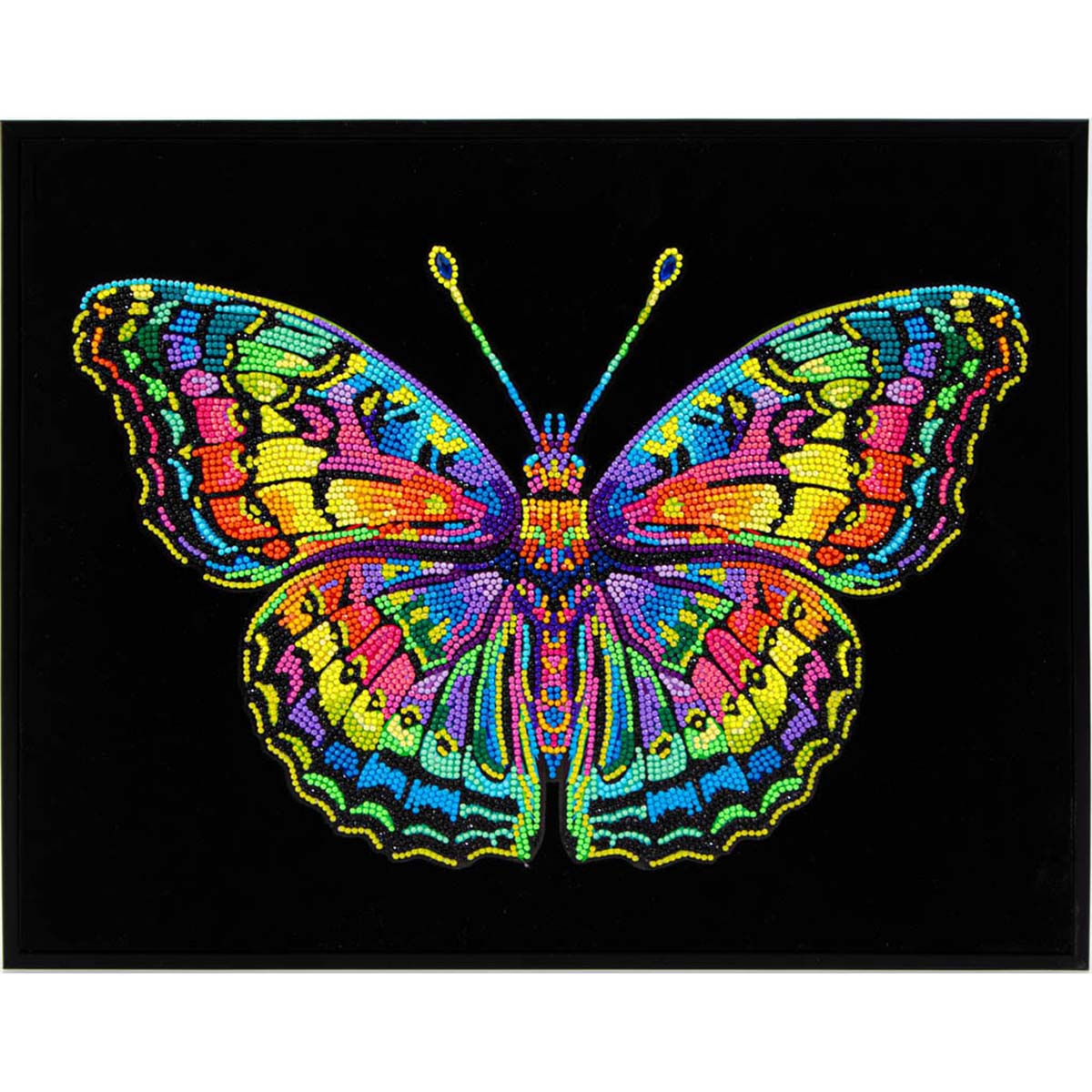 This diamond painting image features a fabulous butterfly with patterned wings in a rainbow of luminous neon colors. Fun and easy diamond paintings are created by arranging sparkling gems on a pre-printed canvas, resulting in eye-catching wall art with a dazzling sparkle. Diamond painting kit includes pre-printed partial-coverage canvas, pre-sorted Diamond Dotz round gems, stylus, tray, wax caddy, and instructions. 18 x 14" (46 x 36cm). • This kit includes color-printed partial-coverage canvas, pre-sorted Diamond Dotz round gems, stylus, tray, wax caddy, and instructions. • This diamond painting design features a butterfly with rainbow-colored neon wings that pop on the black background. • Finished design measures 18 x 14" (46 x 36cm). • Frame is not included.
