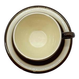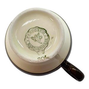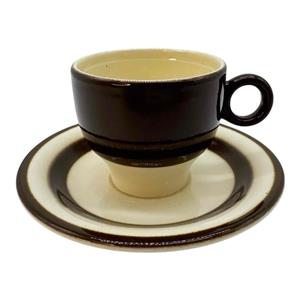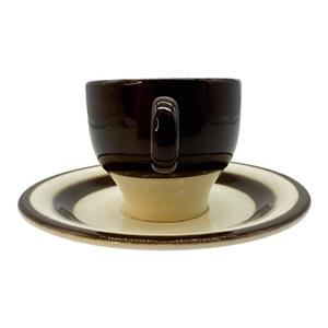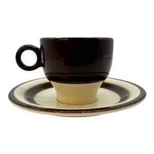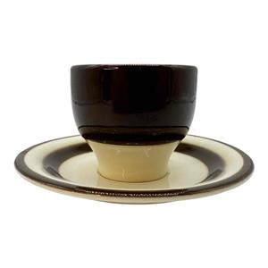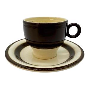 Here is a Vintage Pagnossin of Italy Earthenware Demitasse Espresso Cup & Saucer Set. It is cream with dark brown striping and probably dates before the 1950s. The cup measures approx. 2 1/8" high x 2 3/8" in diameter (3 3/8" to round handle), while the saucer is 4 5/8" in diameter x 1/2" high. The bottom of the cup is backstamped with the maker's mark. The espresso cup and saucer set is in good condition with no chips or cracks, but the saucer has a moderate amount of crazing, and there is a small manufacture flaw in the cup's lip which was glazed over at the factory. Please review photos and excuse the reflections. Item would make a wonderful gift or addition to your own collection!