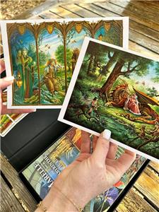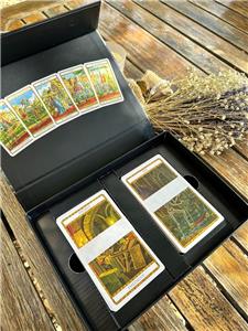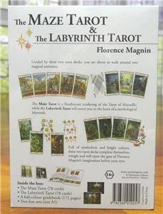 This edition is in the English language, and this kit includes 2 tarot decks. The Maze Tarot & The Labyrinth Tarot. Along with the tarots is a 171 page book that tells of the journey that was taken to bring these decks to fruition. The book describes the cards and instructs how to use & interpret the tarots. Also inside the box are two fine art prints, size A5. These items are encased in a detailed box with magnetic closure.