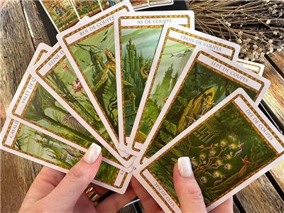 This tarot deck kit is a redesign of the original French language only, Le Tarot Ambre. Le Tarot Ambre was themed after the 10 Roger Zelazny Amber books collectively called The Chronicles of Amber.