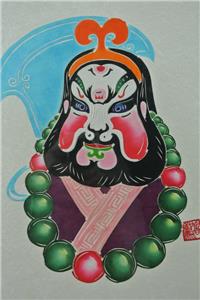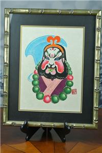 This listing is for an ornate, framed, Chinese Opera Mask which is in the papercutting style of art. This artwork has been double matted and placed in a bamboo style metal frame. The frame measures 16.5"x13.5" and the papercut measures 9.5"x7".