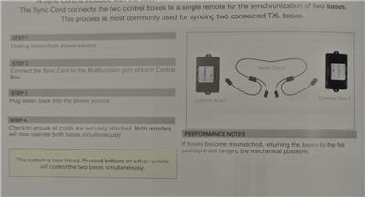 Sync Cord – A sync cord is needed when you have 2 twin/twin XL adjustable bed frames side by side and want to use 1 remote to control both beds at the same time. Both beds will raise/lower at the same time.