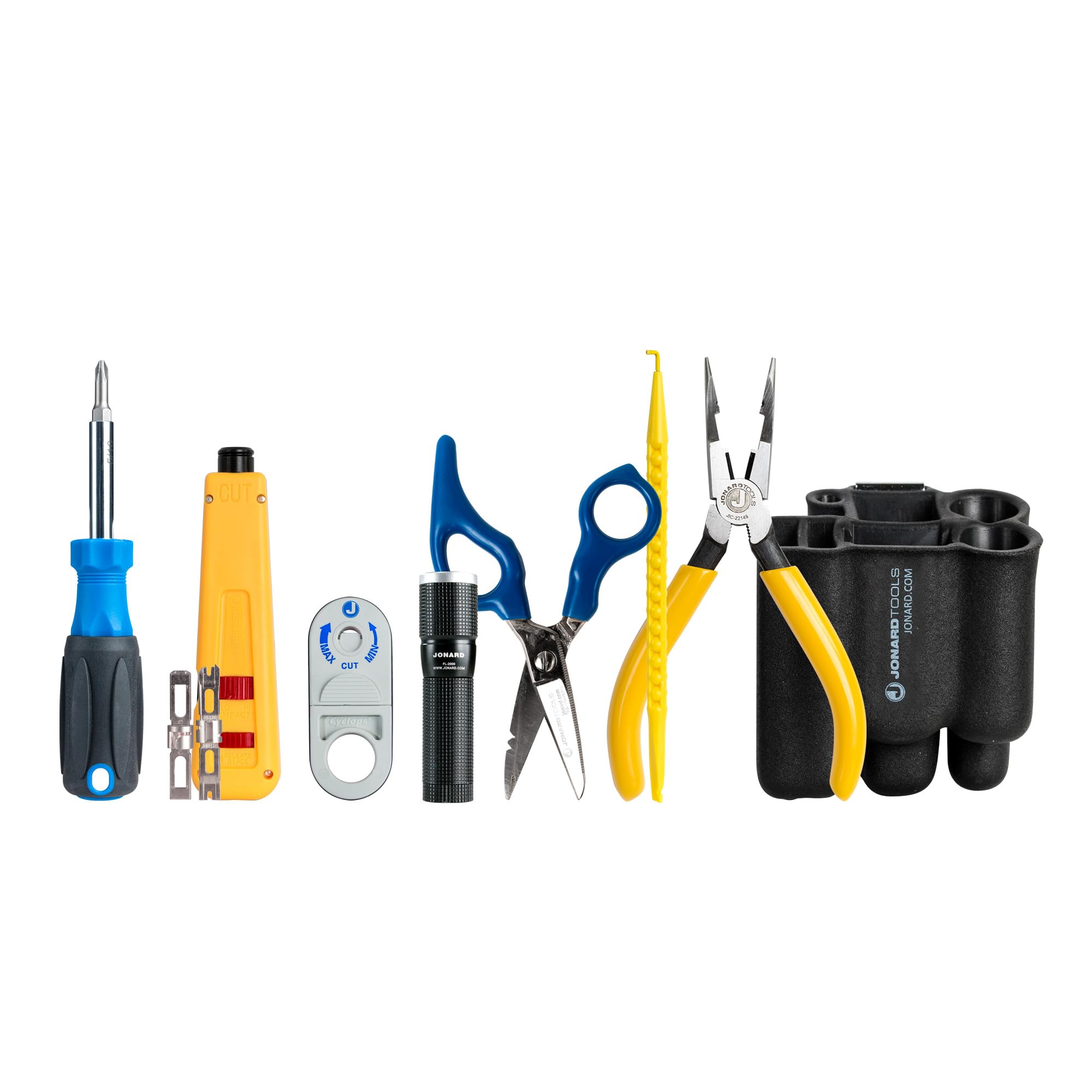 Designed to prepare and connect wire onto 66-type and 110-type punchdown terminal blocks, this punchdown tool kit has the tools needed for maintaining telecommunications and data communications networks. This tool kit is ideal for any data or telecom installer. This kit includes: EPD-91461 - Punchdown Tool with 2 Blades 66 & 110 SD-61 - 6-in-1 Multi-Bit Screwdriver ES-1964ERG - Ergonomic Electrician's Scissors CST-1i - Cyclops Wire Stripper FL-2000 - LED Flashlight with Zoom Lens JIC-22035 - Insulated Probe Pick (Spudger) H-75 - Molded 7 Pocket Tool Pouch JIC-22148 - Combo Crimper, Long Nose Pliers