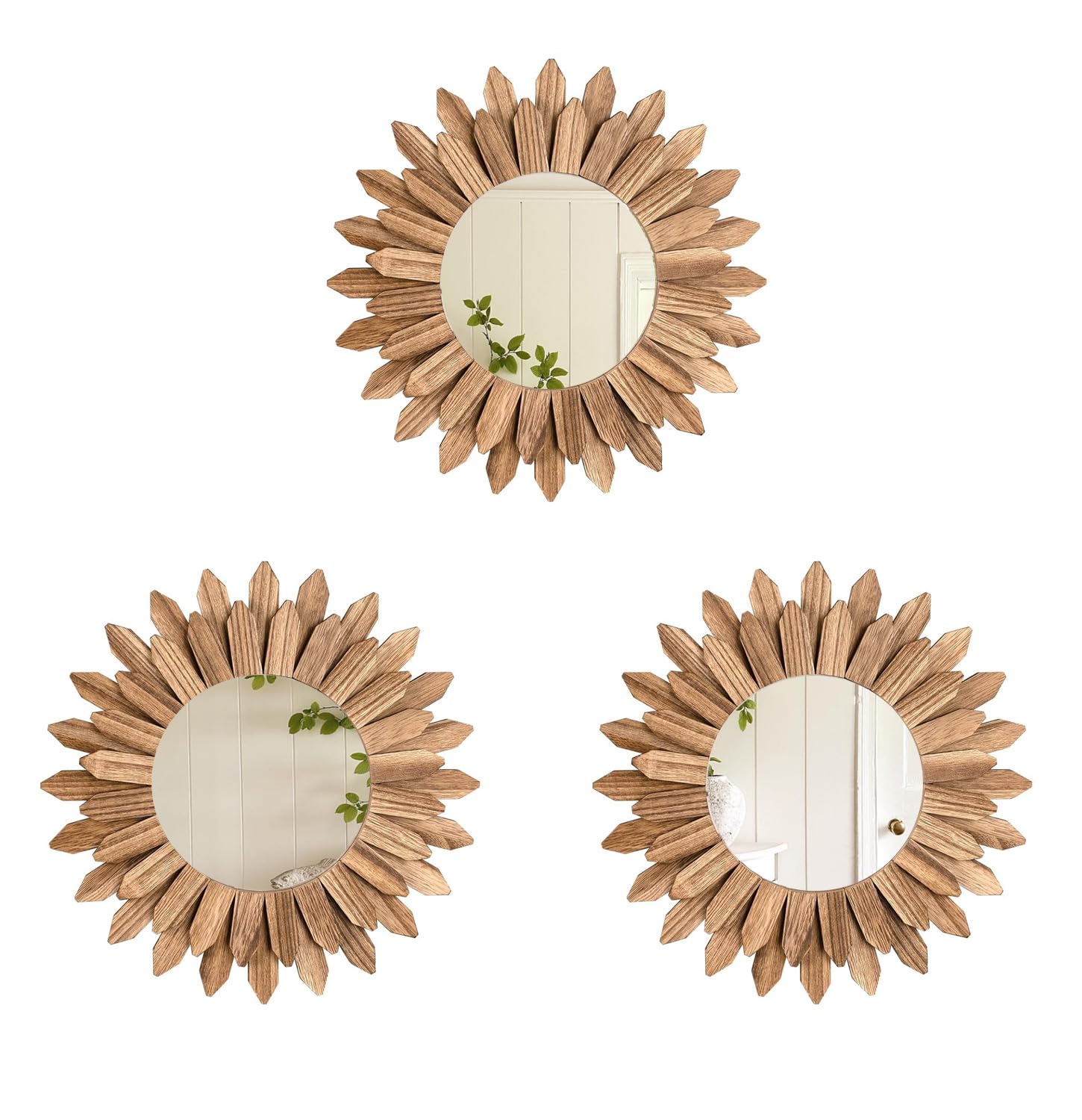 Boho Wall Decor Sunburst Mirror 3 Pack Rustic Round Wood Mirror 12 inch Boho Mirror Home Decor Farmhouse Room Decorations for Bedroom Living Room Entryway