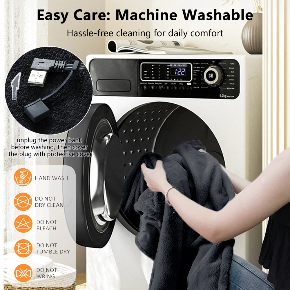 USB Electric Heating Blanket & Wide Application: This raugee blanket heats up when you connect it to a 5V/2A USB port. The USB port design makes it more portable for home or office or walking outdoors or camping, etc. You can take it to anywhere to keep you warm and comfortable in cold weather.