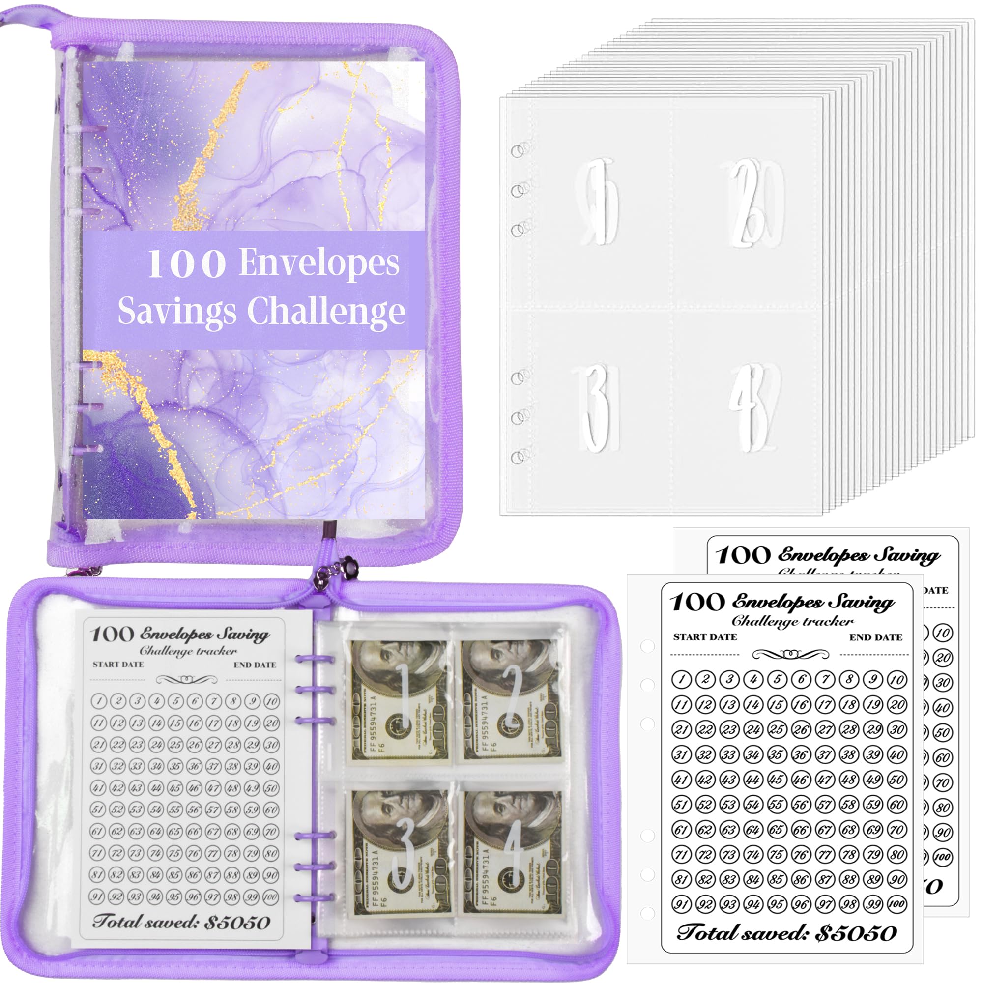 【100 ENVELOPES MONEY SAVING CHALLENGE KIT】This envelopes challenge kit is designed to help you save money in a fun and organized way. It comes with 1 PC A5 size PU binder, 25 pcs 6-hole cash envelopes which printed with number 1-100, and 2 sheets trackers, providing a easy method to save up to $5,050.