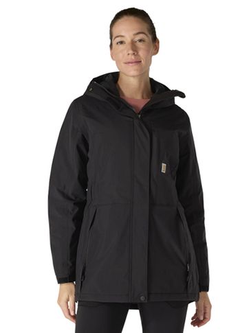 Engineered for all-weather protection, the Carhartt Women's Storm Defender Insulated Coat combines a durable 100% nylon outer shell with synthetic insulation to keep you warm without added bulk. Its Storm Defender waterproof and breathable membrane prevents water penetration while allowing moisture vapor to escape, ensuring dryness and comfort during wet conditions. Fully taped seams enhance waterproofing, while wind-resistant seals block cold gusts. The coat features a full front zipper with a protective storm flap, an adjustable three-panel hood with cinch cords for a secure fit, and adjustable hook-and-loop cuffs to keep out the elements. Multiple zippered pockets provide secure storage for essentials. Designed specifically for women with a relaxed fit, this insulated coat offers freedom of movement and dependable weather protection for work or outdoor activities in fall and colder seasons. Machine washable for easy care, this coat is imported and built to withstand demanding environments.