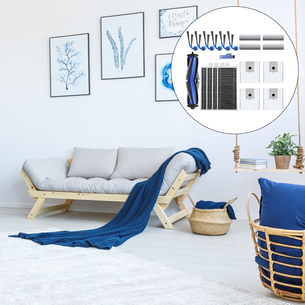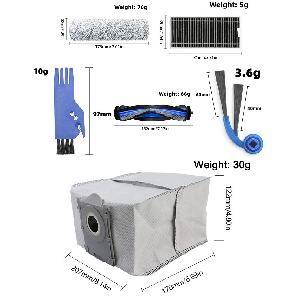 One set:1*main brush+4*rollers+6*side brushes+4*HEPA filters+4*replacement dust bags+1*cleaning tool