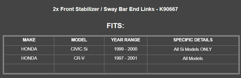 Fitment: MOOG number:K90667,or OE number:51320-S04-003