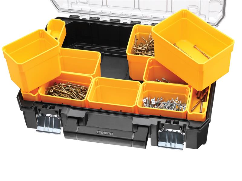 L'organisateur étanche DEWALT TSTAK™ est doté d'un joint d'étanchéité IP54 qui protège de la pénétration de l'eau et de la poussière, gardant le contenu sec et en sécurité. Équipé d'un couvercle en polycarbonate transparent pratiquement indestructible qui permet à l'utilisateur de voir le contenu tout en conservant la résistance du produit.