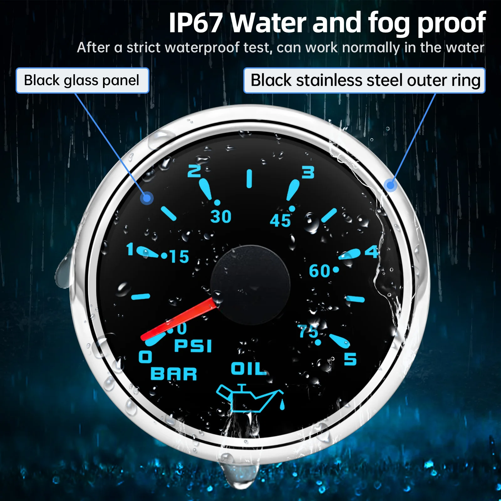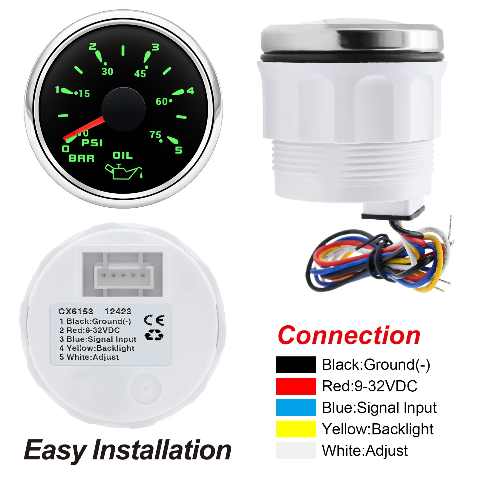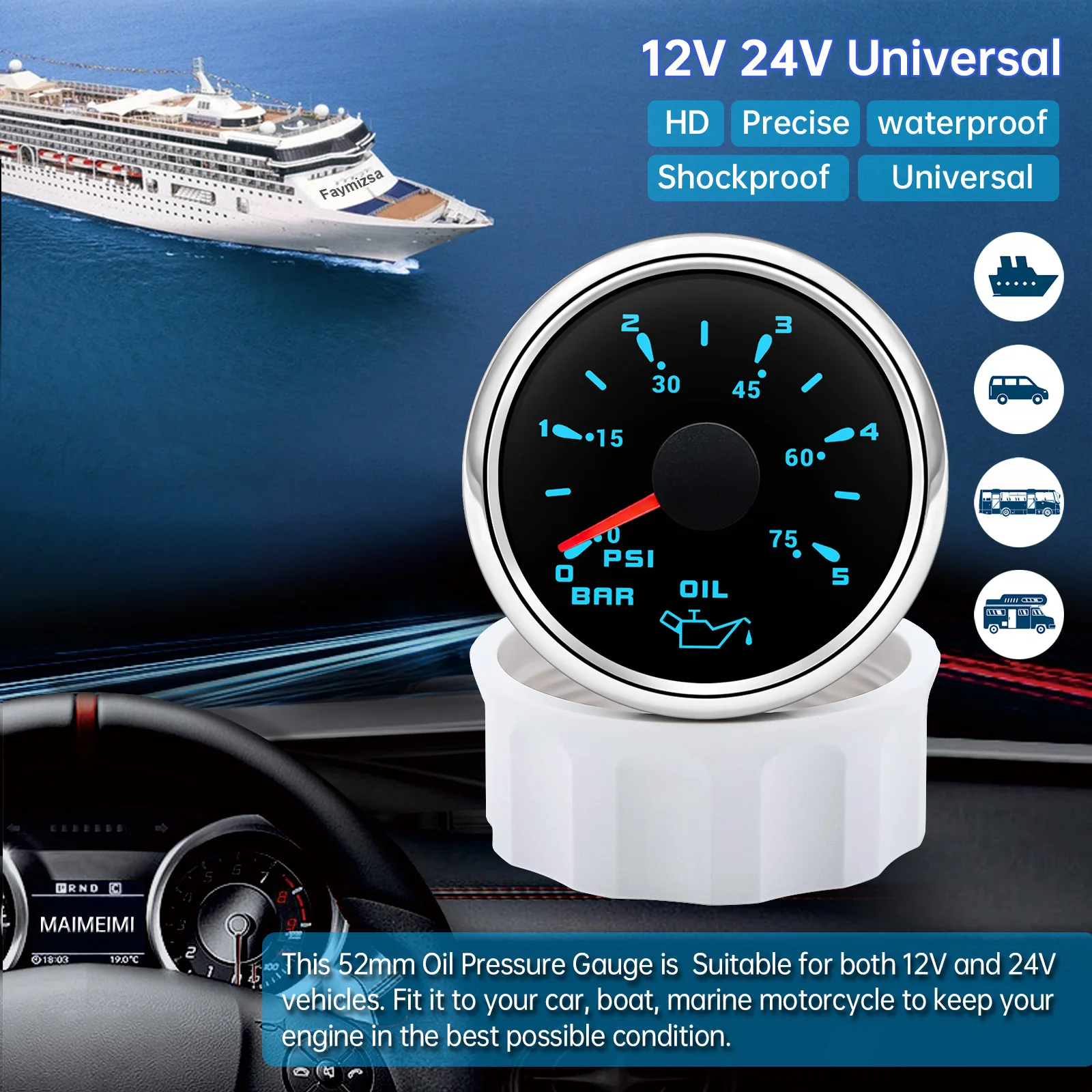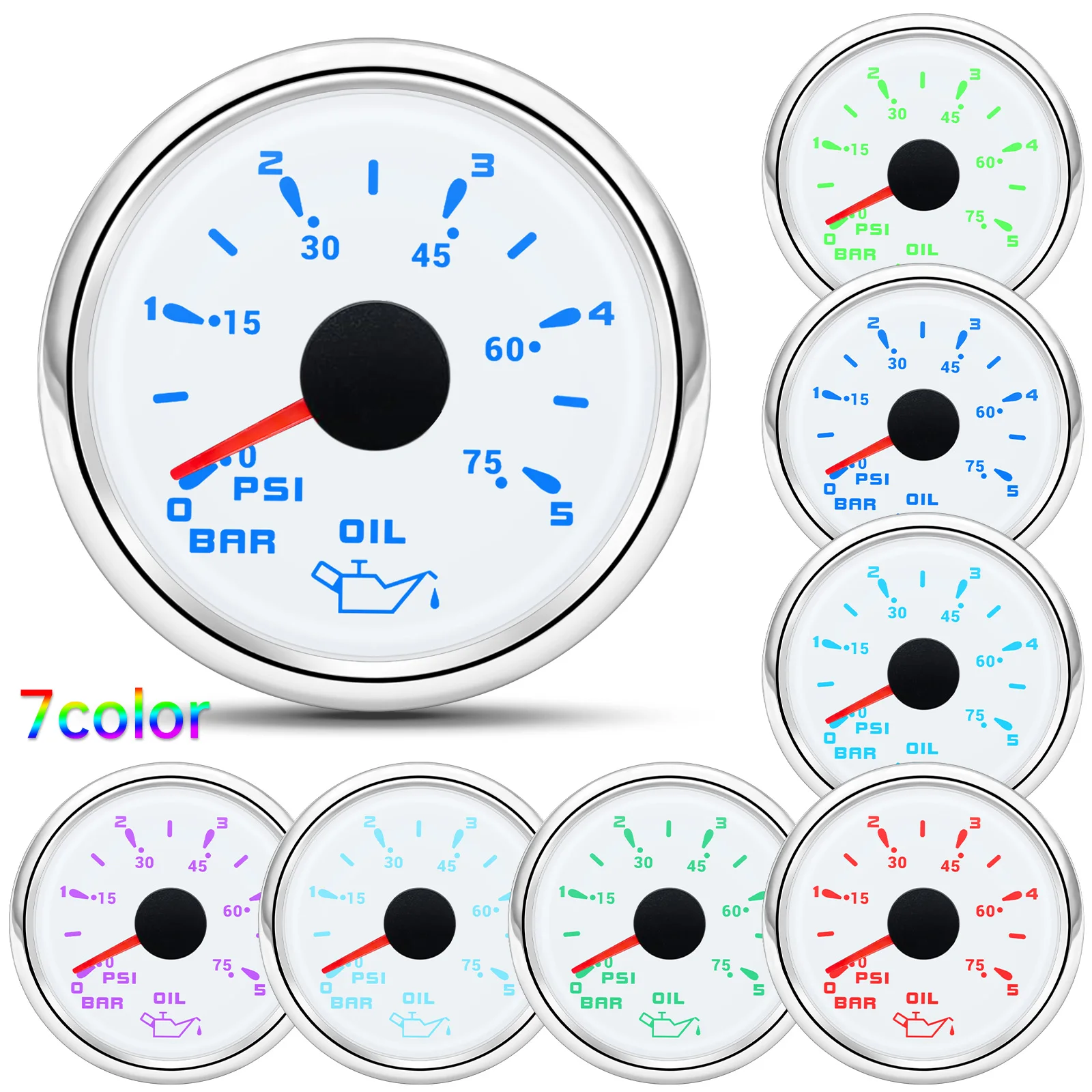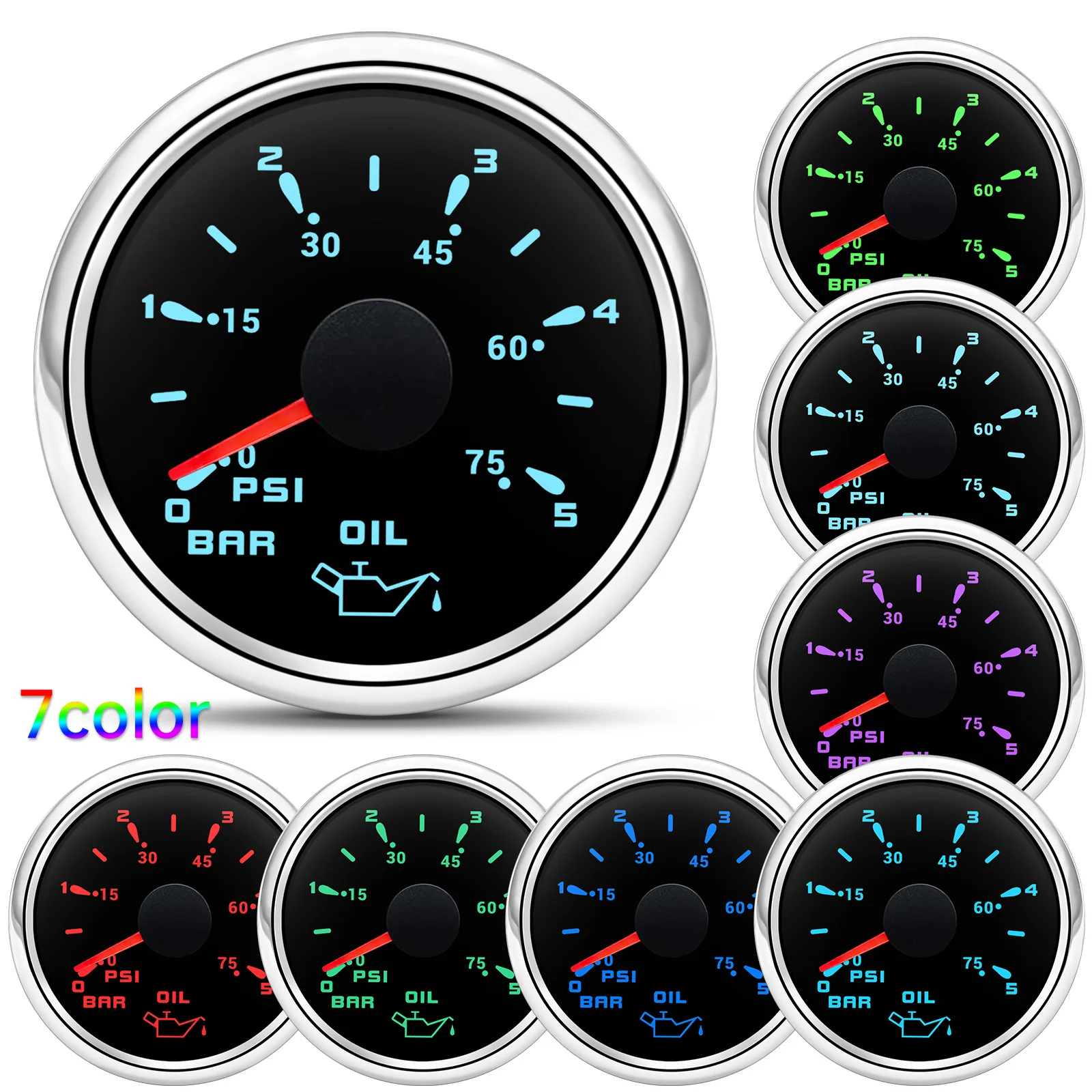 -52MM Oil Pressure Gauge - 7 Color Light - Range: 0-5 Bar/ 0-75PSI - 52mm Oil Pressure Gauge - fitment:for Boat Car 9-32V