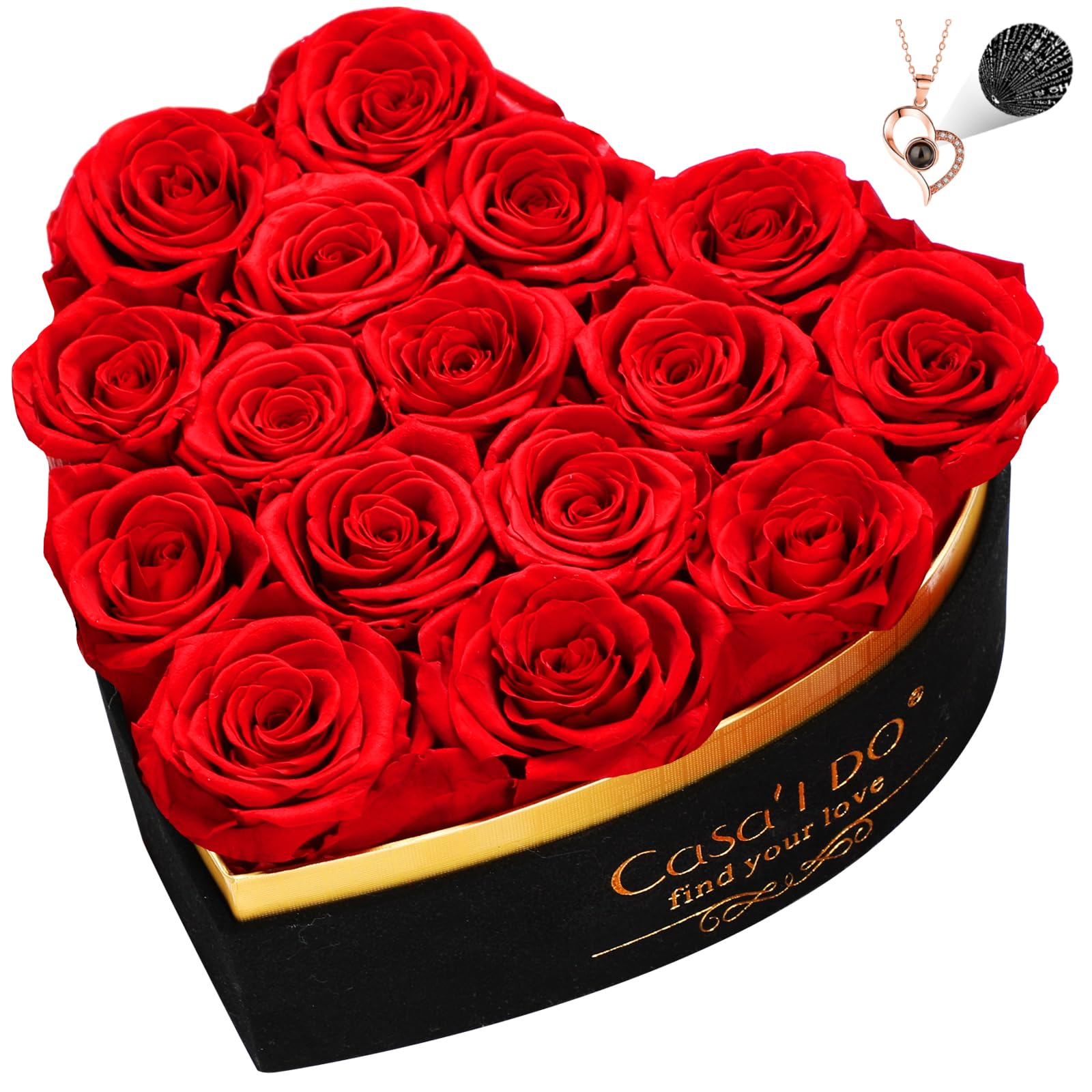 What You Get: 16 Preserved Red Roses with Elegant Heart Shape Gift Box - Carefully arranged in a luxurious display. A Necklace with 100 Languages I LOVE YOU- A beautiful, delicate piece of jewelry tucked inside
