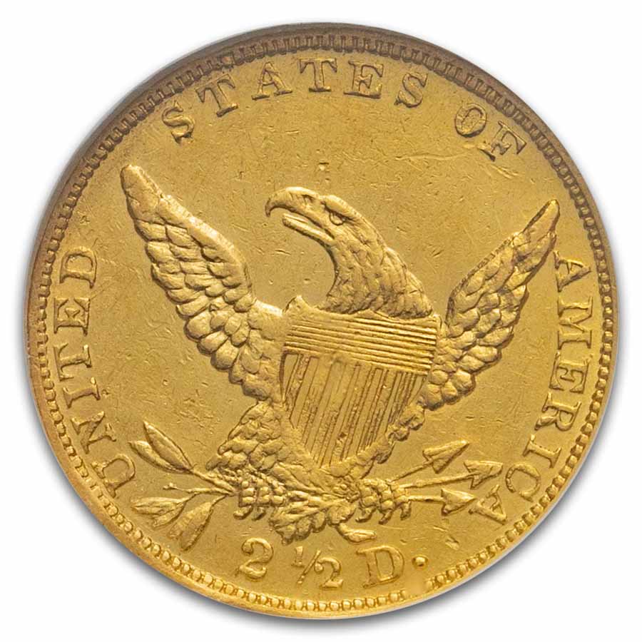 • Reverse: Features a heraldic eagle with a shield on its breast. Surrounding the eagle is UNITED STATES OF AMERICA and the denomination 2 1/2 D. to represent $2.50 dollars.